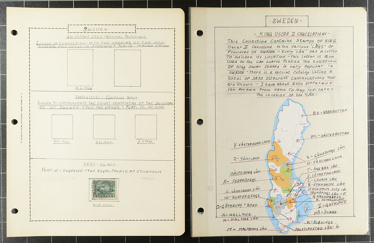 Lovely and comprehensive collection of used King Oscar II issues, 1872-1904, containing many hundreds of stamps on roughly 60 well described homemade pages. This delightful collection is essentially in two halves, the first being shade varieties from the Numeral and King Oscar II issues. The second half dealing with town cancels and types, all identified on pages by the owner, from Stockholm and various Provinces. A spot check indicated some stamps cataloguing $8 to $15 and up each. A lovely collection that should satisfy the Sweden collector, and should be continued and perhaps exhibited. All pages photographed for your viewing pleasure. Estimate =