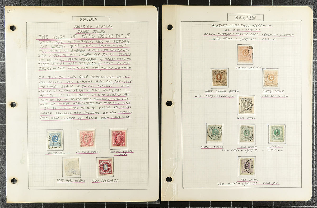Lovely and comprehensive collection of used King Oscar II issues, 1872-1904, containing many hundreds of stamps on roughly 60 well described homemade pages. This delightful collection is essentially in two halves, the first being shade varieties from the Numeral and King Oscar II issues. The second half dealing with town cancels and types, all identified on pages by the owner, from Stockholm and various Provinces. A spot check indicated some stamps cataloguing $8 to $15 and up each. A lovely collection that should satisfy the Sweden collector, and should be continued and perhaps exhibited. All pages photographed for your viewing pleasure. Estimate =