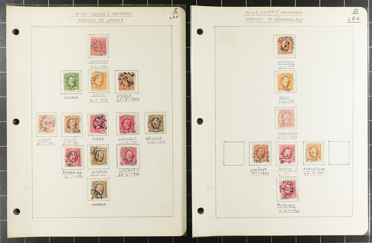Lovely and comprehensive collection of used King Oscar II issues, 1872-1904, containing many hundreds of stamps on roughly 60 well described homemade pages. This delightful collection is essentially in two halves, the first being shade varieties from the Numeral and King Oscar II issues. The second half dealing with town cancels and types, all identified on pages by the owner, from Stockholm and various Provinces. A spot check indicated some stamps cataloguing $8 to $15 and up each. A lovely collection that should satisfy the Sweden collector, and should be continued and perhaps exhibited. All pages photographed for your viewing pleasure. Estimate =