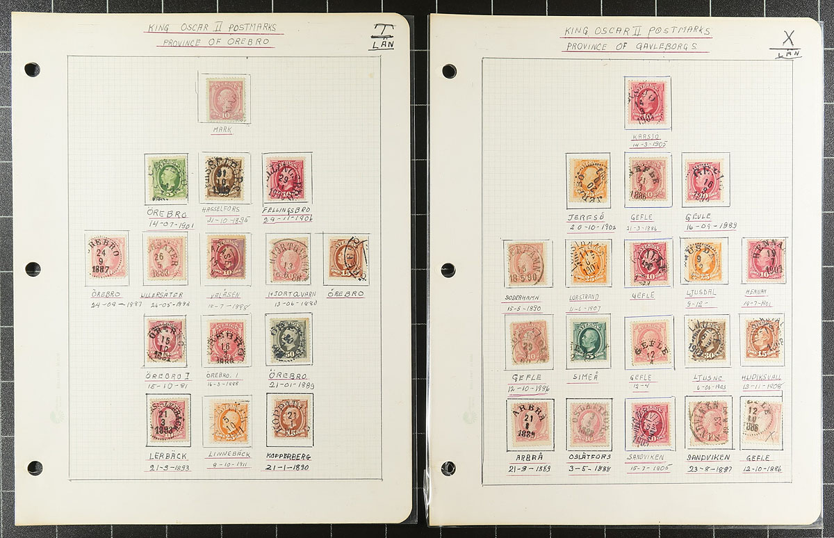 Lovely and comprehensive collection of used King Oscar II issues, 1872-1904, containing many hundreds of stamps on roughly 60 well described homemade pages. This delightful collection is essentially in two halves, the first being shade varieties from the Numeral and King Oscar II issues. The second half dealing with town cancels and types, all identified on pages by the owner, from Stockholm and various Provinces. A spot check indicated some stamps cataloguing $8 to $15 and up each. A lovely collection that should satisfy the Sweden collector, and should be continued and perhaps exhibited. All pages photographed for your viewing pleasure. Estimate =