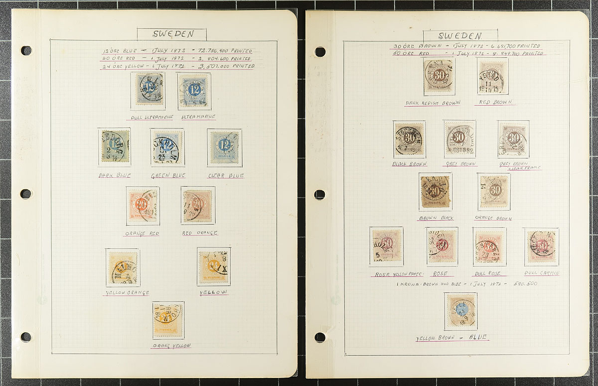 Lovely and comprehensive collection of used King Oscar II issues, 1872-1904, containing many hundreds of stamps on roughly 60 well described homemade pages. This delightful collection is essentially in two halves, the first being shade varieties from the Numeral and King Oscar II issues. The second half dealing with town cancels and types, all identified on pages by the owner, from Stockholm and various Provinces. A spot check indicated some stamps cataloguing $8 to $15 and up each. A lovely collection that should satisfy the Sweden collector, and should be continued and perhaps exhibited. All pages photographed for your viewing pleasure. Estimate =