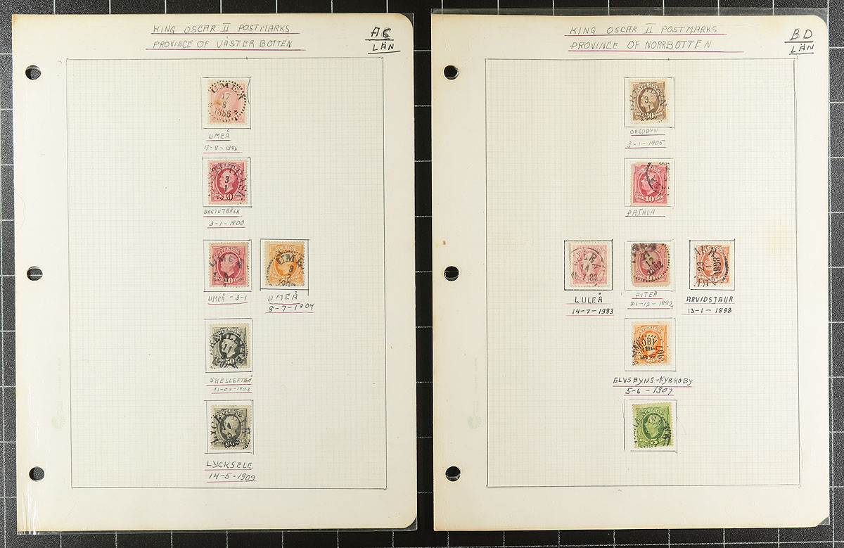 Lovely and comprehensive collection of used King Oscar II issues, 1872-1904, containing many hundreds of stamps on roughly 60 well described homemade pages. This delightful collection is essentially in two halves, the first being shade varieties from the Numeral and King Oscar II issues. The second half dealing with town cancels and types, all identified on pages by the owner, from Stockholm and various Provinces. A spot check indicated some stamps cataloguing $8 to $15 and up each. A lovely collection that should satisfy the Sweden collector, and should be continued and perhaps exhibited. All pages photographed for your viewing pleasure. Estimate =