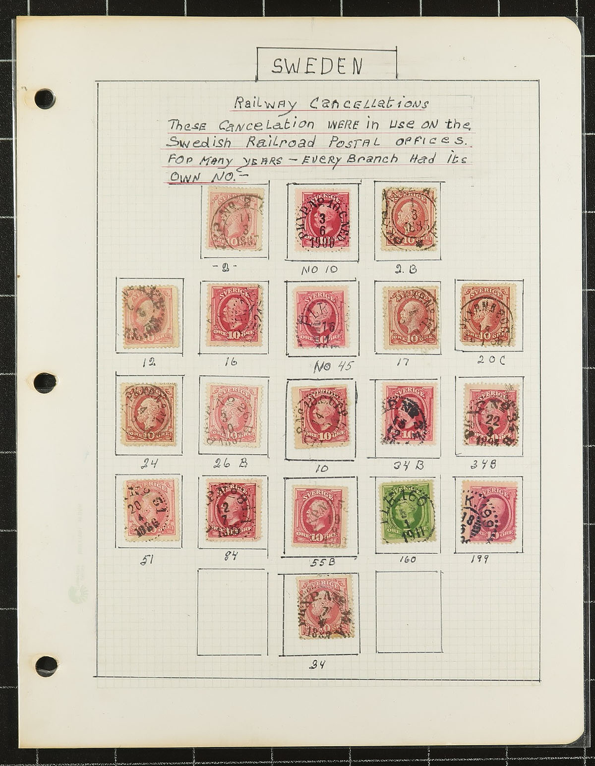 Lovely and comprehensive collection of used King Oscar II issues, 1872-1904, containing many hundreds of stamps on roughly 60 well described homemade pages. This delightful collection is essentially in two halves, the first being shade varieties from the Numeral and King Oscar II issues. The second half dealing with town cancels and types, all identified on pages by the owner, from Stockholm and various Provinces. A spot check indicated some stamps cataloguing $8 to $15 and up each. A lovely collection that should satisfy the Sweden collector, and should be continued and perhaps exhibited. All pages photographed for your viewing pleasure. Estimate =