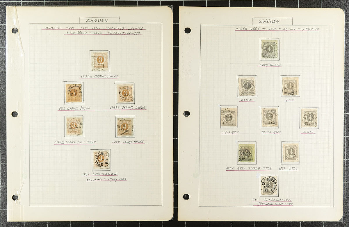 Lovely and comprehensive collection of used King Oscar II issues, 1872-1904, containing many hundreds of stamps on roughly 60 well described homemade pages. This delightful collection is essentially in two halves, the first being shade varieties from the Numeral and King Oscar II issues. The second half dealing with town cancels and types, all identified on pages by the owner, from Stockholm and various Provinces. A spot check indicated some stamps cataloguing $8 to $15 and up each. A lovely collection that should satisfy the Sweden collector, and should be continued and perhaps exhibited. All pages photographed for your viewing pleasure. Estimate =