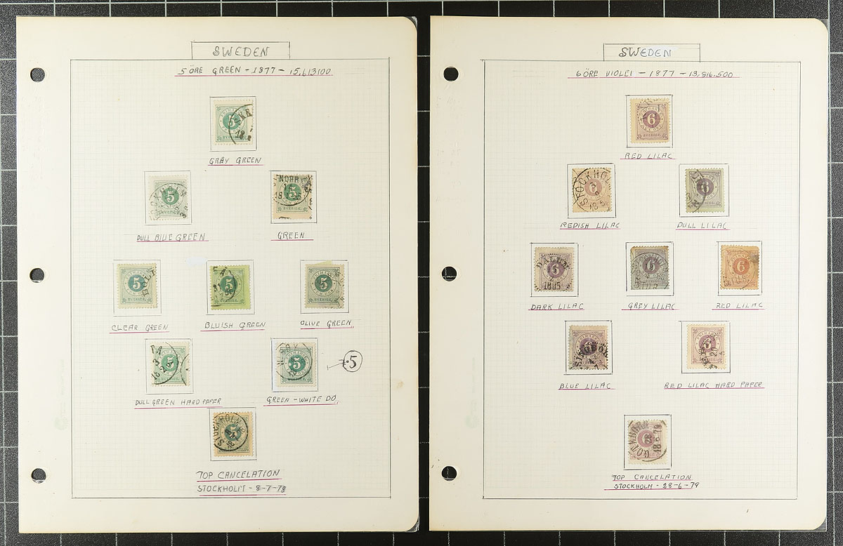 Lovely and comprehensive collection of used King Oscar II issues, 1872-1904, containing many hundreds of stamps on roughly 60 well described homemade pages. This delightful collection is essentially in two halves, the first being shade varieties from the Numeral and King Oscar II issues. The second half dealing with town cancels and types, all identified on pages by the owner, from Stockholm and various Provinces. A spot check indicated some stamps cataloguing $8 to $15 and up each. A lovely collection that should satisfy the Sweden collector, and should be continued and perhaps exhibited. All pages photographed for your viewing pleasure. Estimate =