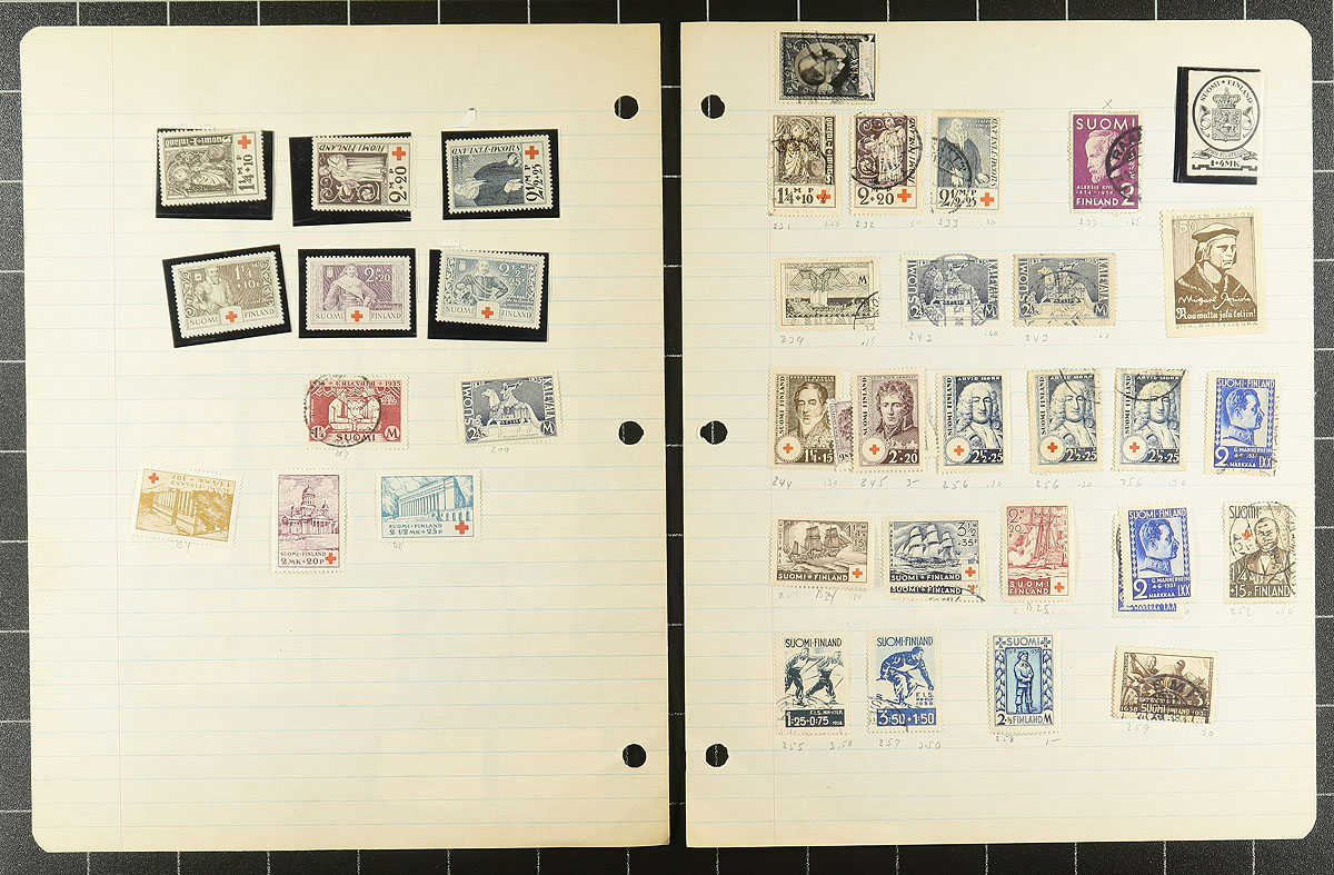Old-time collection / accumulation of mint and primarily used Finland, 1866-1961, containing many hundreds of stamps on several homemade pages or stock pages. The lot generally ranges from Scott #7/386, noting singles, sets, along with mint and used semi-postals, and a few stamps from Aland and Karelia. The lot itself is a very interesting accumulation and fairly unorganized of mostly early issues noting #s used 7 (x2), 9, 13, 22, 25, 27-28, 30, and mint 49, 54, 111-118, just to name a few. A cursory check indicated some material cataloguing $10 to $15 and up each, leaving potential finds, including better postmarks to the dedicated collector. A nice unpicked lot that has not been on the market in decades, a few faults as expected with a few early issues, overall fine to very fine. Estimate =