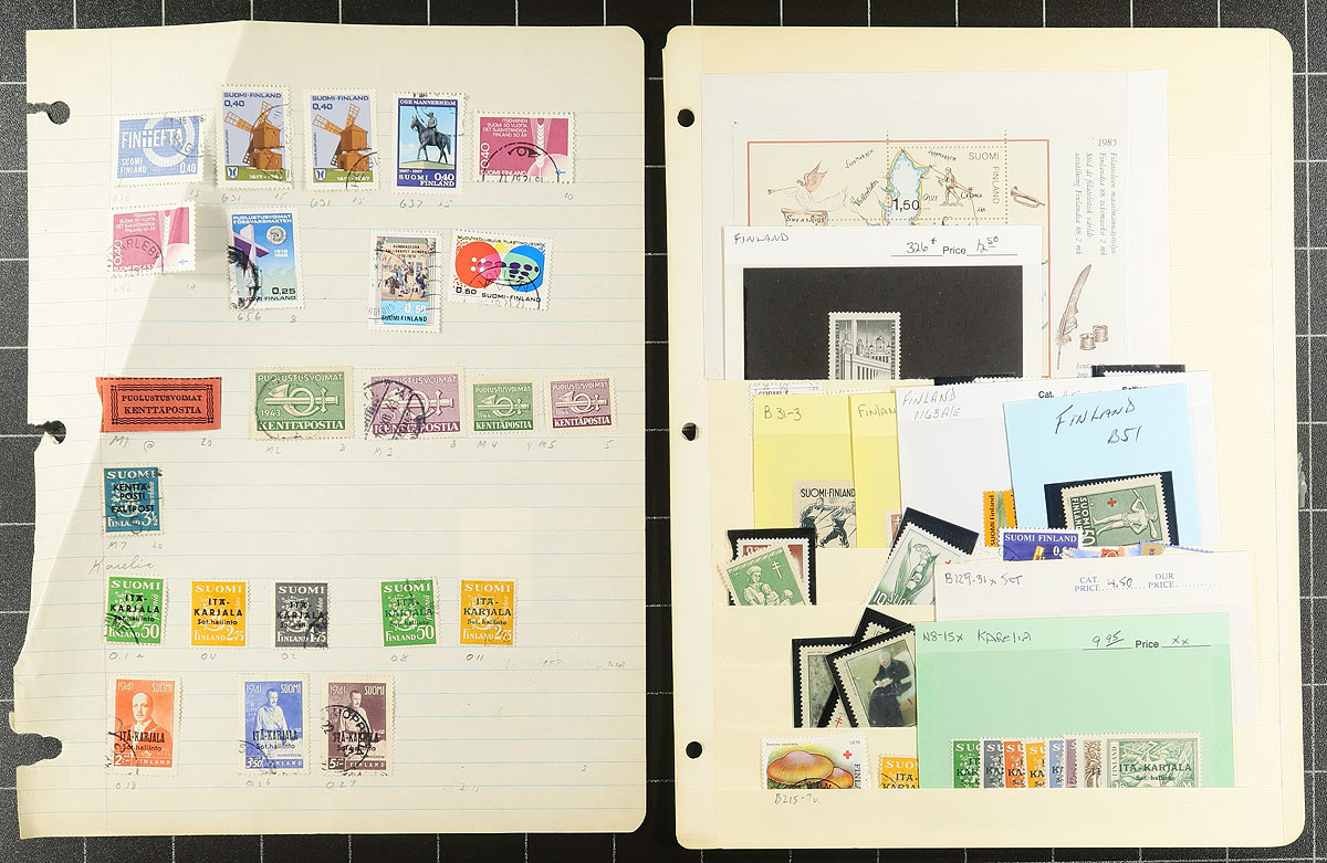 Old-time collection / accumulation of mint and primarily used Finland, 1866-1961, containing many hundreds of stamps on several homemade pages or stock pages. The lot generally ranges from Scott #7/386, noting singles, sets, along with mint and used semi-postals, and a few stamps from Aland and Karelia. The lot itself is a very interesting accumulation and fairly unorganized of mostly early issues noting #s used 7 (x2), 9, 13, 22, 25, 27-28, 30, and mint 49, 54, 111-118, just to name a few. A cursory check indicated some material cataloguing $10 to $15 and up each, leaving potential finds, including better postmarks to the dedicated collector. A nice unpicked lot that has not been on the market in decades, a few faults as expected with a few early issues, overall fine to very fine. Estimate =
