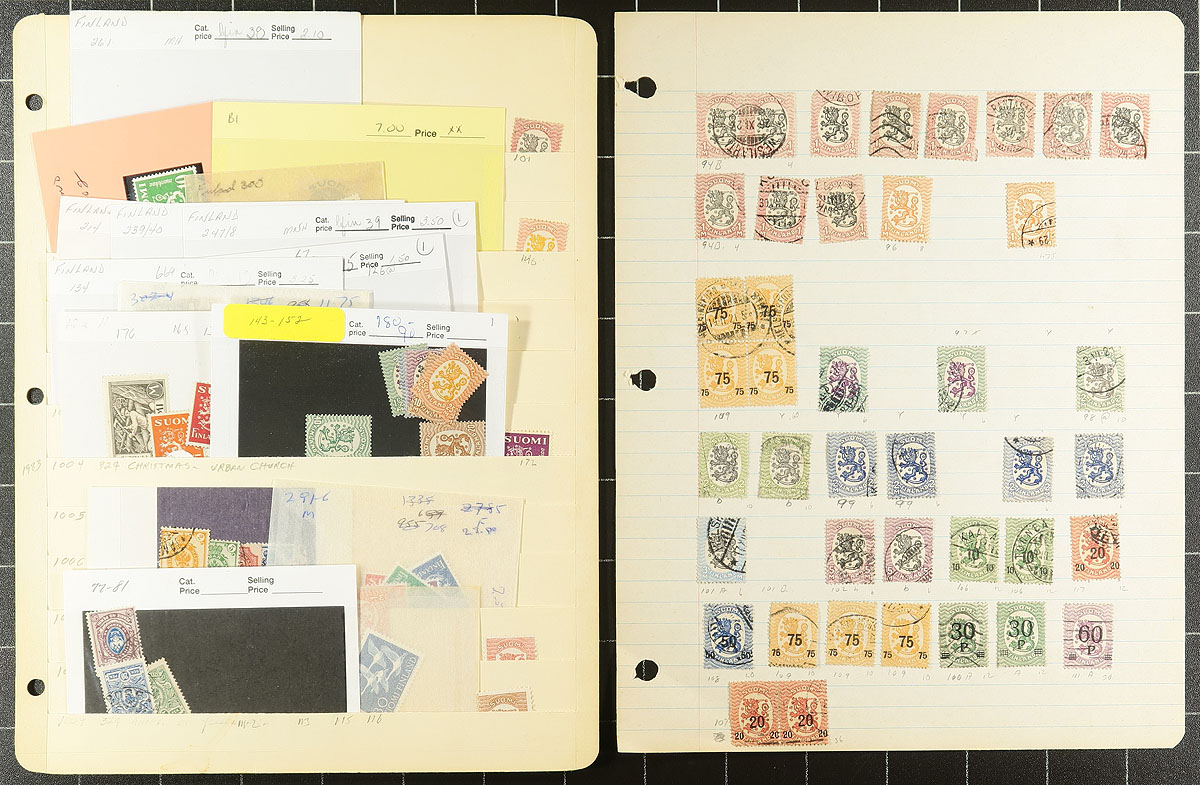 Old-time collection / accumulation of mint and primarily used Finland, 1866-1961, containing many hundreds of stamps on several homemade pages or stock pages. The lot generally ranges from Scott #7/386, noting singles, sets, along with mint and used semi-postals, and a few stamps from Aland and Karelia. The lot itself is a very interesting accumulation and fairly unorganized of mostly early issues noting #s used 7 (x2), 9, 13, 22, 25, 27-28, 30, and mint 49, 54, 111-118, just to name a few. A cursory check indicated some material cataloguing $10 to $15 and up each, leaving potential finds, including better postmarks to the dedicated collector. A nice unpicked lot that has not been on the market in decades, a few faults as expected with a few early issues, overall fine to very fine. Estimate =