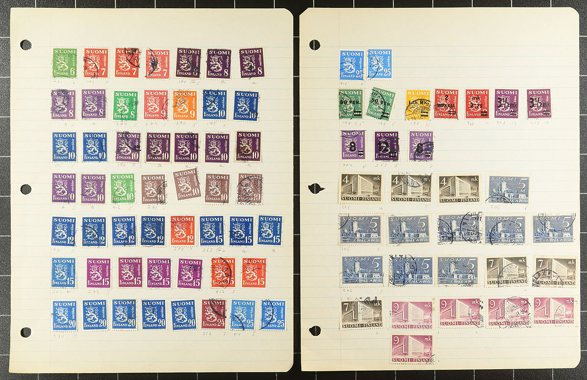 Old-time collection / accumulation of mint and primarily used Finland, 1866-1961, containing many hundreds of stamps on several homemade pages or stock pages. The lot generally ranges from Scott #7/386, noting singles, sets, along with mint and used semi-postals, and a few stamps from Aland and Karelia. The lot itself is a very interesting accumulation and fairly unorganized of mostly early issues noting #s used 7 (x2), 9, 13, 22, 25, 27-28, 30, and mint 49, 54, 111-118, just to name a few. A cursory check indicated some material cataloguing $10 to $15 and up each, leaving potential finds, including better postmarks to the dedicated collector. A nice unpicked lot that has not been on the market in decades, a few faults as expected with a few early issues, overall fine to very fine. Estimate =