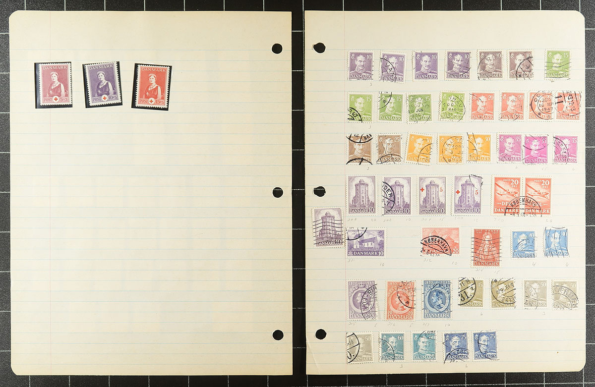 Old-time collection / accumulation of mint and primarily used Denmark, 1858-1962, containing many hundreds of stamps on several homemade pages or stock pages. The lot generally ranges from Scott #7/403, noting singles and partial sets, along with plate blocks, semi-postals and other back of the book issues. The lot is fairly unorganized accumulation of mostly early issues, noting several bi-colour issues, with a cursory check indicating #s with used 7 (x3), 13, 25, 27, 33, 41c, 50b, 51, 51b, 52b, and mint 112-113, 115, 125, 130, 134 (mh, $61 total), along with some issues cataloguing $10 and up including #P9 (used, $45). A nice unpicked lot with potential finds for the dedicated collector, and has not been on the market in decades, a few small faults with the early issues, overall fine to very fine. Estimate =
