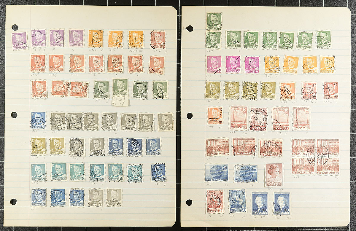 Old-time collection / accumulation of mint and primarily used Denmark, 1858-1962, containing many hundreds of stamps on several homemade pages or stock pages. The lot generally ranges from Scott #7/403, noting singles and partial sets, along with plate blocks, semi-postals and other back of the book issues. The lot is fairly unorganized accumulation of mostly early issues, noting several bi-colour issues, with a cursory check indicating #s with used 7 (x3), 13, 25, 27, 33, 41c, 50b, 51, 51b, 52b, and mint 112-113, 115, 125, 130, 134 (mh, $61 total), along with some issues cataloguing $10 and up including #P9 (used, $45). A nice unpicked lot with potential finds for the dedicated collector, and has not been on the market in decades, a few small faults with the early issues, overall fine to very fine. Estimate =