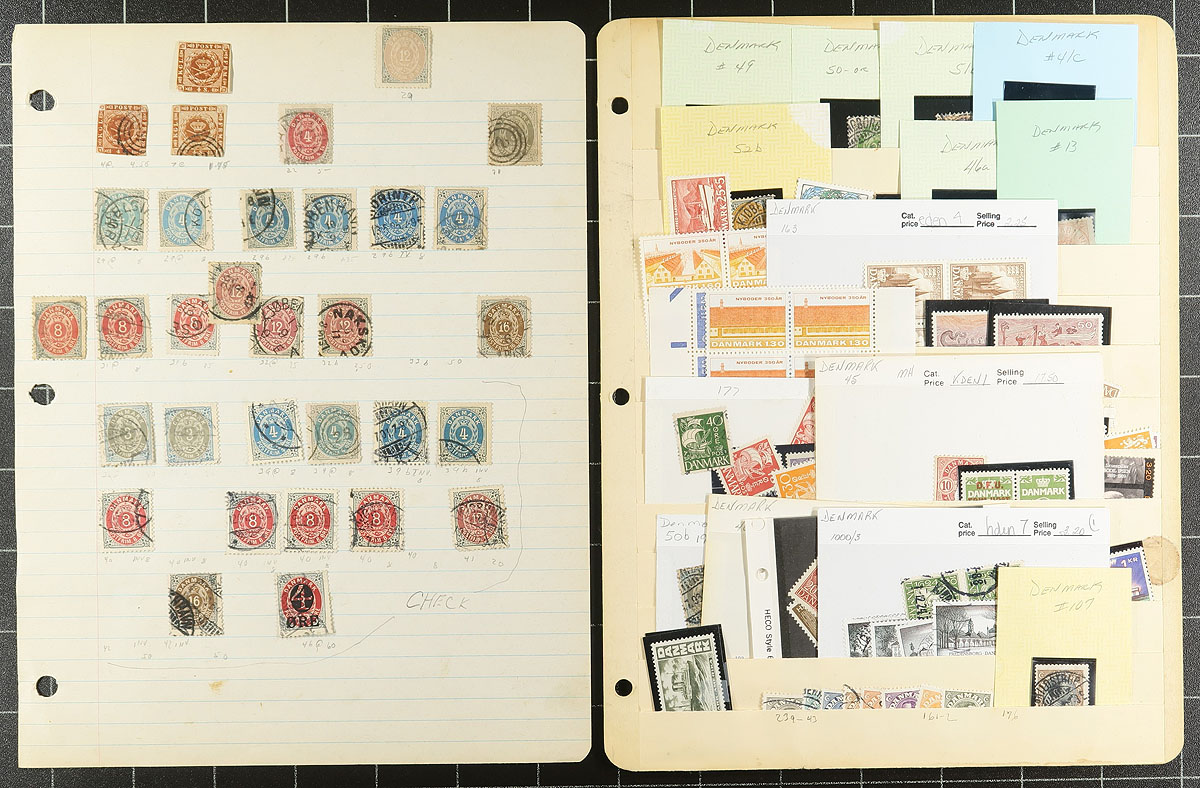 Old-time collection / accumulation of mint and primarily used Denmark, 1858-1962, containing many hundreds of stamps on several homemade pages or stock pages. The lot generally ranges from Scott #7/403, noting singles and partial sets, along with plate blocks, semi-postals and other back of the book issues. The lot is fairly unorganized accumulation of mostly early issues, noting several bi-colour issues, with a cursory check indicating #s with used 7 (x3), 13, 25, 27, 33, 41c, 50b, 51, 51b, 52b, and mint 112-113, 115, 125, 130, 134 (mh, $61 total), along with some issues cataloguing $10 and up including #P9 (used, $45). A nice unpicked lot with potential finds for the dedicated collector, and has not been on the market in decades, a few small faults with the early issues, overall fine to very fine. Estimate =