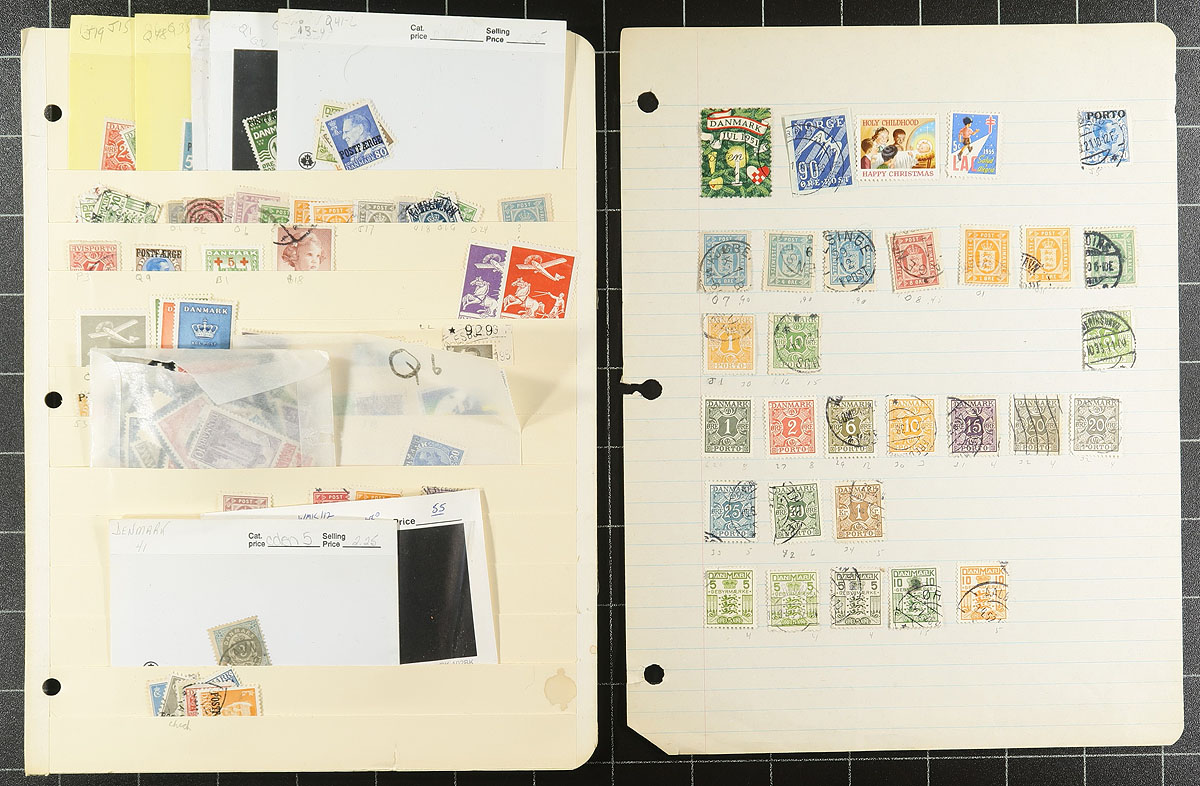 Old-time collection / accumulation of mint and primarily used Denmark, 1858-1962, containing many hundreds of stamps on several homemade pages or stock pages. The lot generally ranges from Scott #7/403, noting singles and partial sets, along with plate blocks, semi-postals and other back of the book issues. The lot is fairly unorganized accumulation of mostly early issues, noting several bi-colour issues, with a cursory check indicating #s with used 7 (x3), 13, 25, 27, 33, 41c, 50b, 51, 51b, 52b, and mint 112-113, 115, 125, 130, 134 (mh, $61 total), along with some issues cataloguing $10 and up including #P9 (used, $45). A nice unpicked lot with potential finds for the dedicated collector, and has not been on the market in decades, a few small faults with the early issues, overall fine to very fine. Estimate =