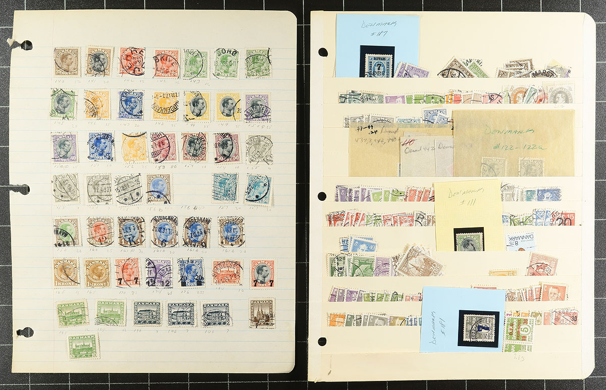 Old-time collection / accumulation of mint and primarily used Denmark, 1858-1962, containing many hundreds of stamps on several homemade pages or stock pages. The lot generally ranges from Scott #7/403, noting singles and partial sets, along with plate blocks, semi-postals and other back of the book issues. The lot is fairly unorganized accumulation of mostly early issues, noting several bi-colour issues, with a cursory check indicating #s with used 7 (x3), 13, 25, 27, 33, 41c, 50b, 51, 51b, 52b, and mint 112-113, 115, 125, 130, 134 (mh, $61 total), along with some issues cataloguing $10 and up including #P9 (used, $45). A nice unpicked lot with potential finds for the dedicated collector, and has not been on the market in decades, a few small faults with the early issues, overall fine to very fine. Estimate =