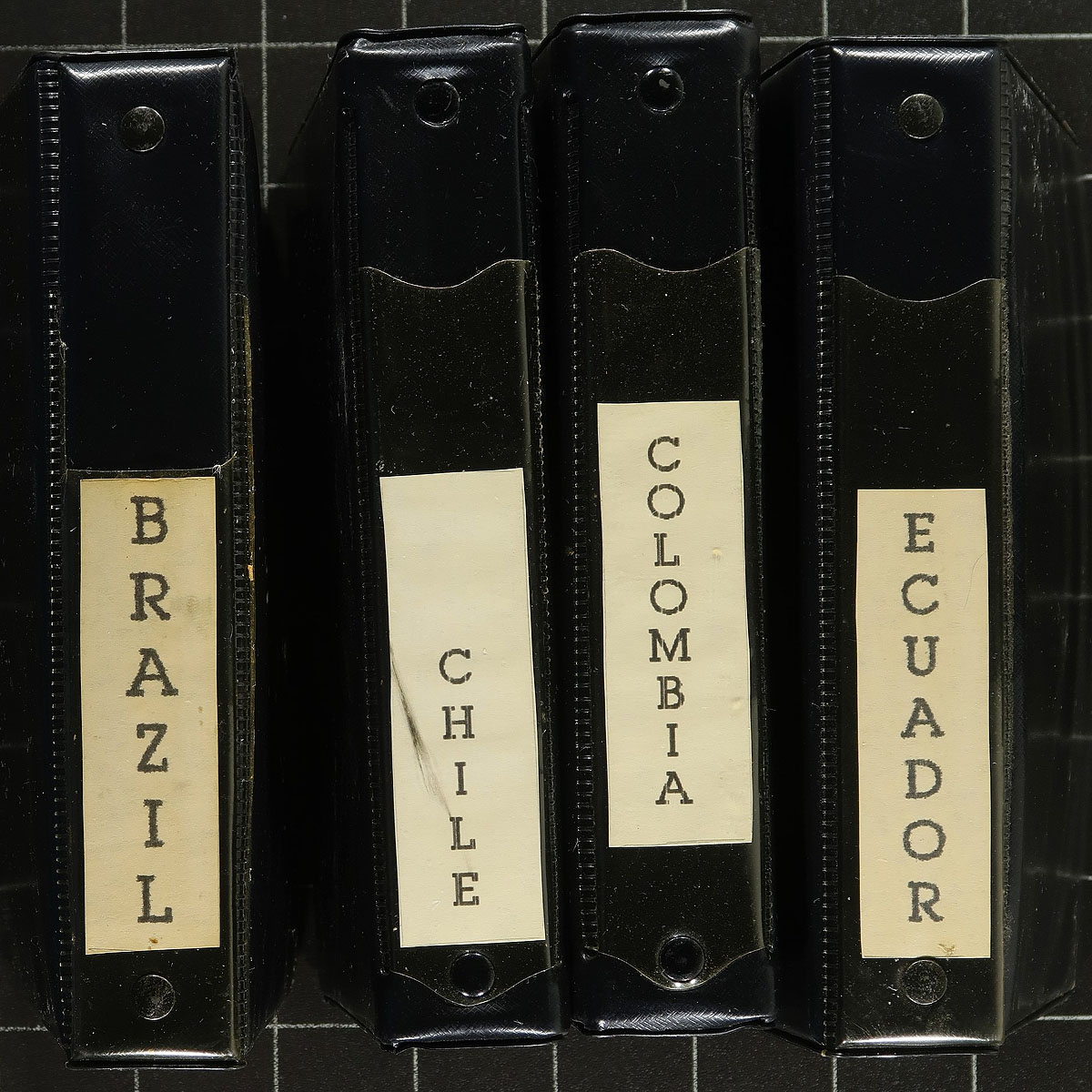 Tidy lot of mint and used South America stamps in 4 counter books. The lot contains mostly material from Brazil, along with Ecuador, Colombia, and Chile, with about 125 dealer pages, with material ranging from the 1890's to the 1960's, noting mint and or used singles, sets, including several airmail issues. Each page is well identified with older catalogue value, but most stamps appear to range from $2 and under. A nice lot from this interesting region, overall fine to very fine. Estimate =