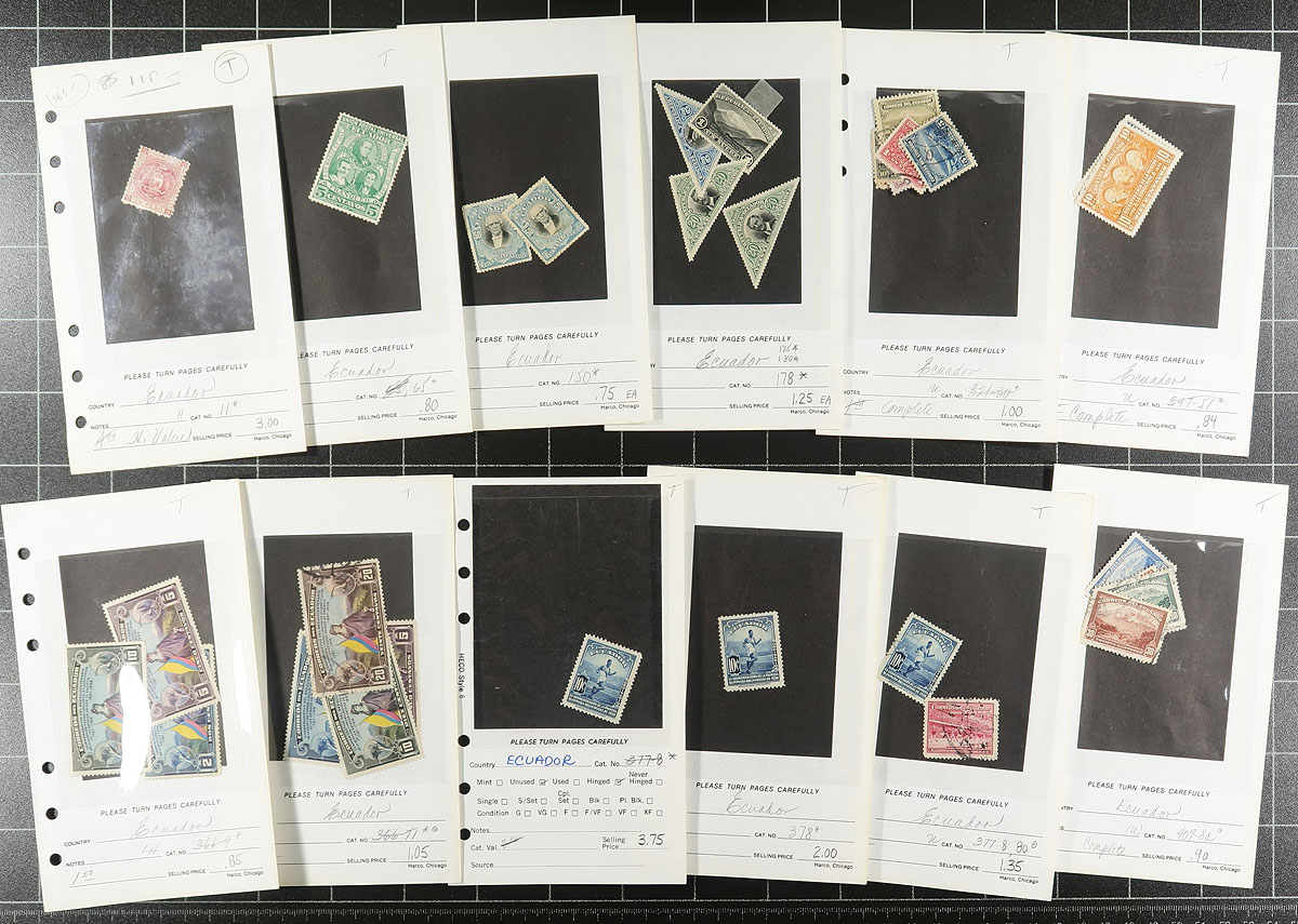 Tidy lot of mint and used South America stamps in 4 counter books. The lot contains mostly material from Brazil, along with Ecuador, Colombia, and Chile, with about 125 dealer pages, with material ranging from the 1890's to the 1960's, noting mint and or used singles, sets, including several airmail issues. Each page is well identified with older catalogue value, but most stamps appear to range from $2 and under. A nice lot from this interesting region, overall fine to very fine. Estimate =