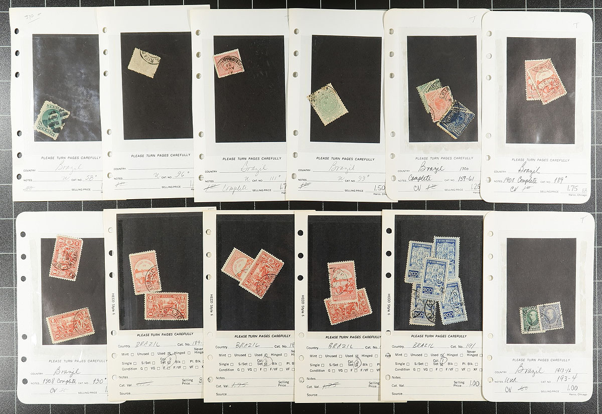 Tidy lot of mint and used South America stamps in 4 counter books. The lot contains mostly material from Brazil, along with Ecuador, Colombia, and Chile, with about 125 dealer pages, with material ranging from the 1890's to the 1960's, noting mint and or used singles, sets, including several airmail issues. Each page is well identified with older catalogue value, but most stamps appear to range from $2 and under. A nice lot from this interesting region, overall fine to very fine. Estimate =