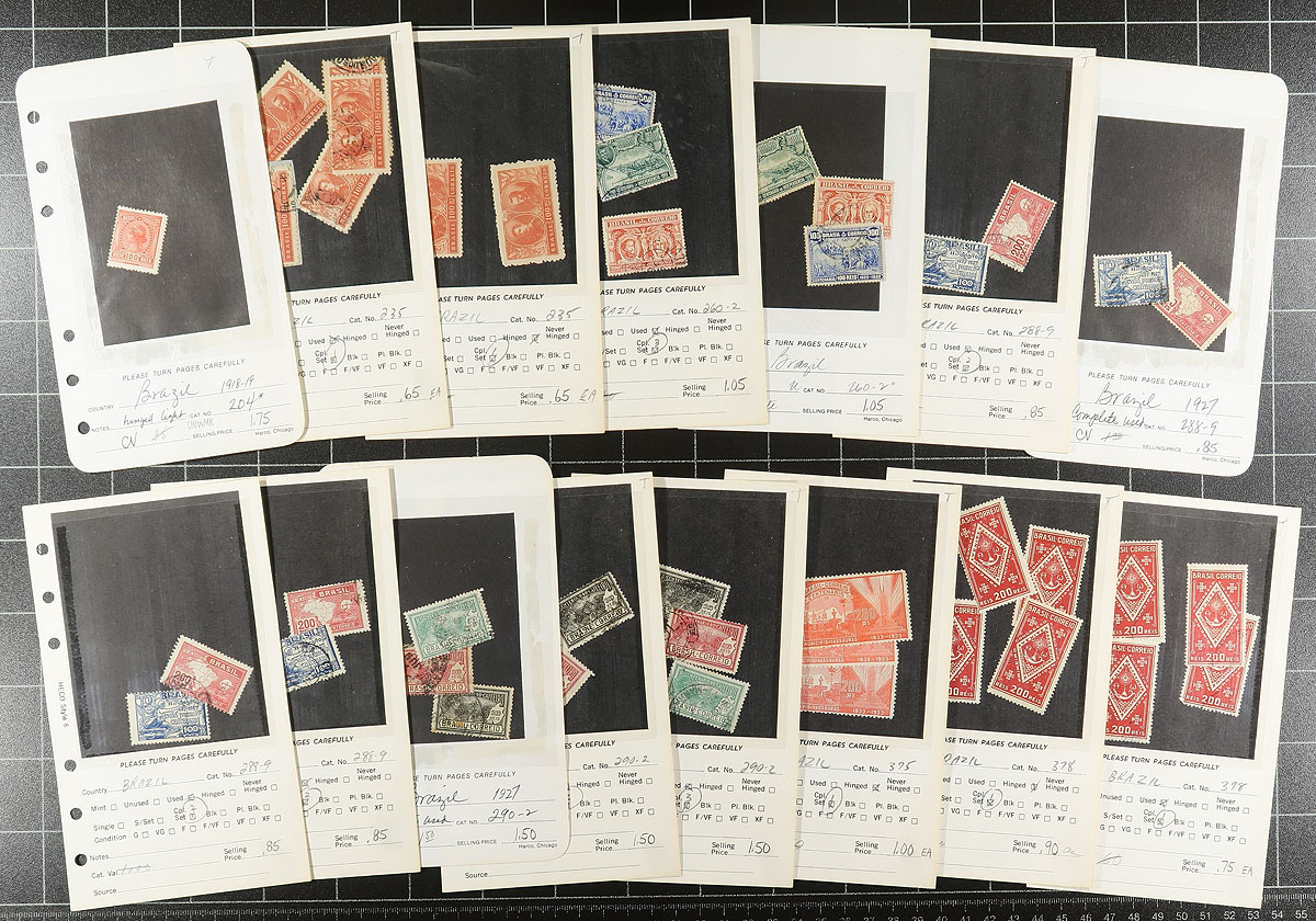 Tidy lot of mint and used South America stamps in 4 counter books. The lot contains mostly material from Brazil, along with Ecuador, Colombia, and Chile, with about 125 dealer pages, with material ranging from the 1890's to the 1960's, noting mint and or used singles, sets, including several airmail issues. Each page is well identified with older catalogue value, but most stamps appear to range from $2 and under. A nice lot from this interesting region, overall fine to very fine. Estimate =