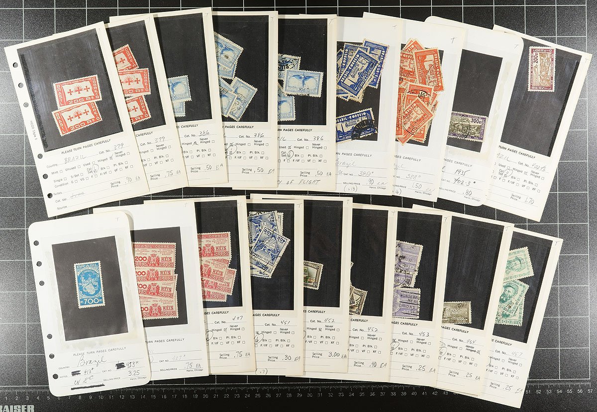Tidy lot of mint and used South America stamps in 4 counter books. The lot contains mostly material from Brazil, along with Ecuador, Colombia, and Chile, with about 125 dealer pages, with material ranging from the 1890's to the 1960's, noting mint and or used singles, sets, including several airmail issues. Each page is well identified with older catalogue value, but most stamps appear to range from $2 and under. A nice lot from this interesting region, overall fine to very fine. Estimate =