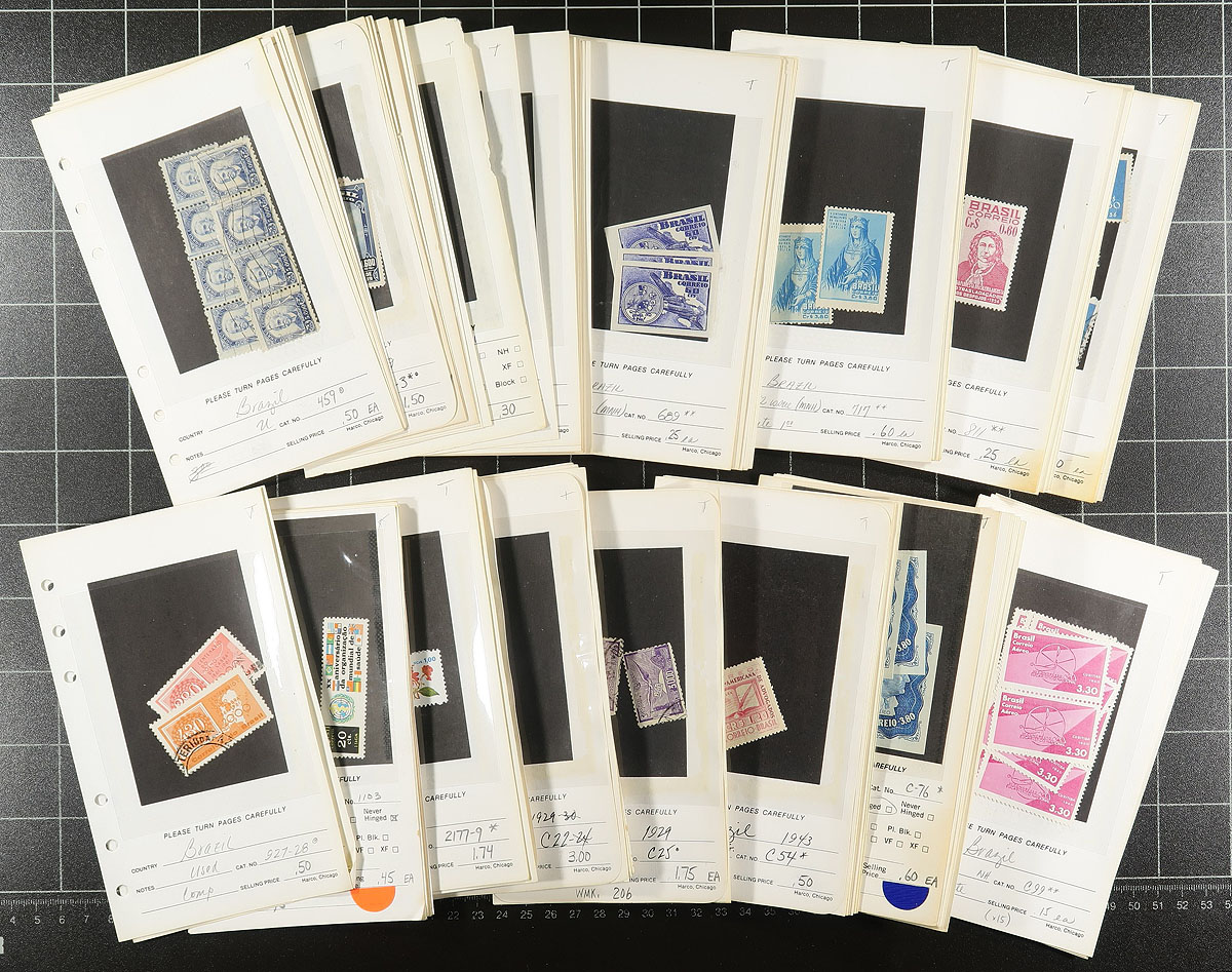 Tidy lot of mint and used South America stamps in 4 counter books. The lot contains mostly material from Brazil, along with Ecuador, Colombia, and Chile, with about 125 dealer pages, with material ranging from the 1890's to the 1960's, noting mint and or used singles, sets, including several airmail issues. Each page is well identified with older catalogue value, but most stamps appear to range from $2 and under. A nice lot from this interesting region, overall fine to very fine. Estimate =