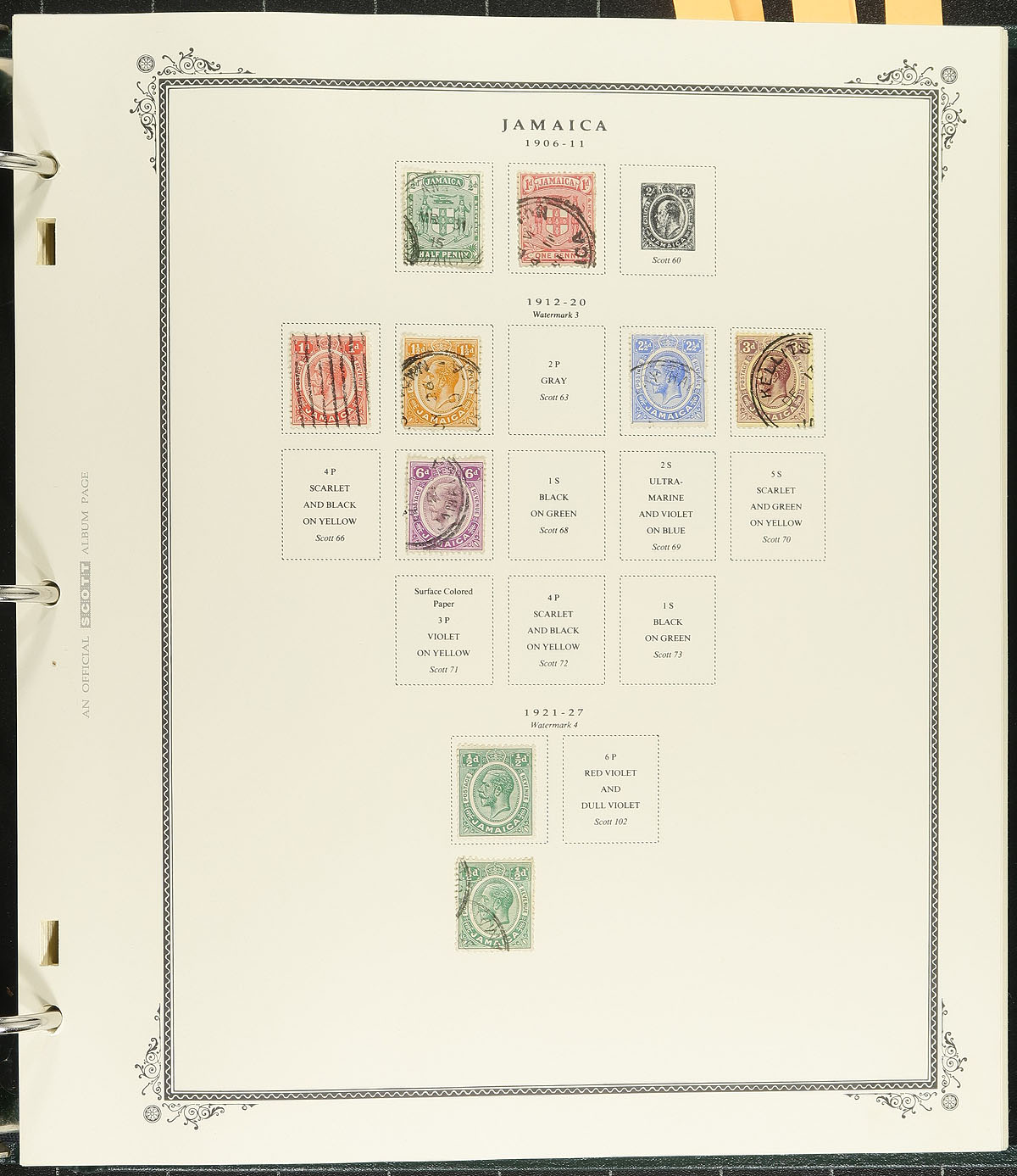 Collection of used Jamaica, 1870-1992, containing a few hundred stamps in a lovely Scott Specialty album. The collection ranges from Scott #9/768, containing singles and a few back of the book stamps, with a few Victorian issues and better representation from 1900 to the 1970's (sparse material hereafter). A spot check indicated a few items cataloguing $5 and up, and is essentially a starter collection for the Jamaica or Commonwealth collector. The best value is with the album itself (with pages up to 1996), and would retail a few hundred dollars alone. Overall fine to very fine. Estimate =