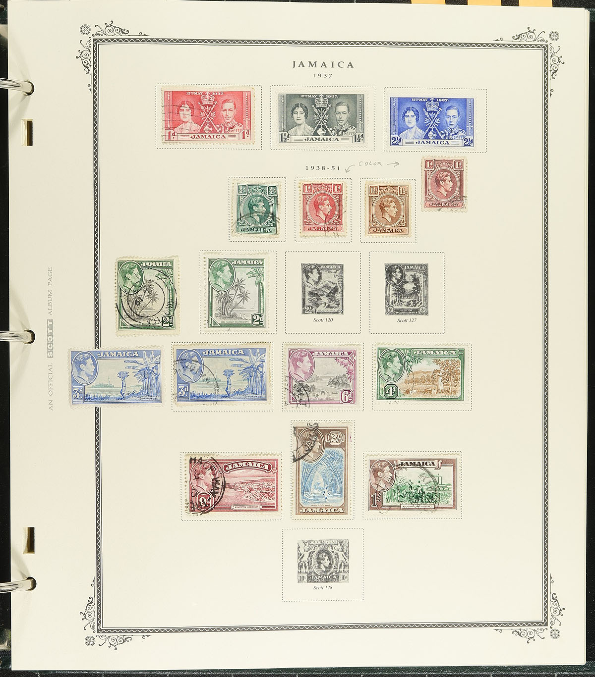Collection of used Jamaica, 1870-1992, containing a few hundred stamps in a lovely Scott Specialty album. The collection ranges from Scott #9/768, containing singles and a few back of the book stamps, with a few Victorian issues and better representation from 1900 to the 1970's (sparse material hereafter). A spot check indicated a few items cataloguing $5 and up, and is essentially a starter collection for the Jamaica or Commonwealth collector. The best value is with the album itself (with pages up to 1996), and would retail a few hundred dollars alone. Overall fine to very fine. Estimate =