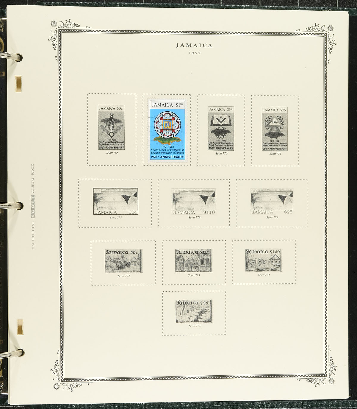 Collection of used Jamaica, 1870-1992, containing a few hundred stamps in a lovely Scott Specialty album. The collection ranges from Scott #9/768, containing singles and a few back of the book stamps, with a few Victorian issues and better representation from 1900 to the 1970's (sparse material hereafter). A spot check indicated a few items cataloguing $5 and up, and is essentially a starter collection for the Jamaica or Commonwealth collector. The best value is with the album itself (with pages up to 1996), and would retail a few hundred dollars alone. Overall fine to very fine. Estimate =