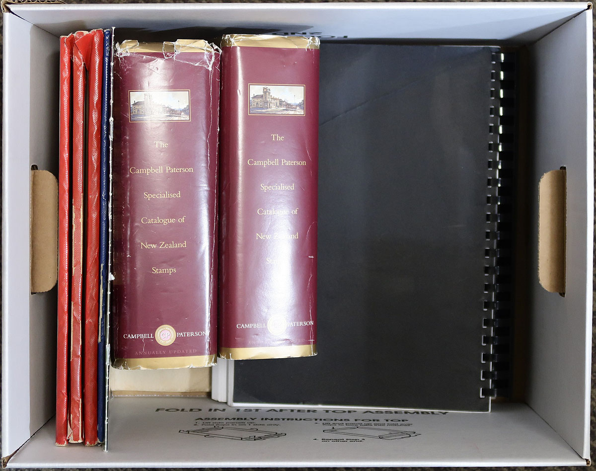 Literature Holding. A group of catalogues, featuring the two volume Campbell Paterson (with updates to 2021, one binder damaged), three First Day Cover cachet catalogues by Jones (regular issue pre-decimal & Health to 2000) and Thackery. A well loved, five booklet complete set of Samuels postal stationery catalogues (1988-1993, still the current versions). Finishing with the 2002 Heslop/Holmes Cinderella Catalogue. A mix of current and out of print references filling a bankers box. Nice to get these here in Canada, as most have to be ordered from overseas. Estimate =