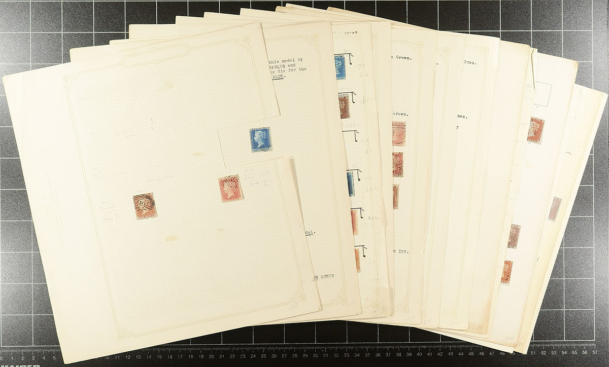 Scraps of collections (Part 1). We see a surprising number of British collection fragments: pages taken (and sometimes cut out) from a variety of sources, with different collecting styles and focuses. These pages often have some better singles, nice cancels and studies of plate numbers. For whatever reason, they have been left somewhat intact, awaiting the next collector to take a kick at improving their collection. This selection of pages, from at least four collectors, includes Queen Victoria with lots of “Penny Reds” and “Tuppence Blue”, and not much after 1860. We urge you to ignore the 1947 catalogue prices. Duplication and mixed condition is to be expected. Estimate =