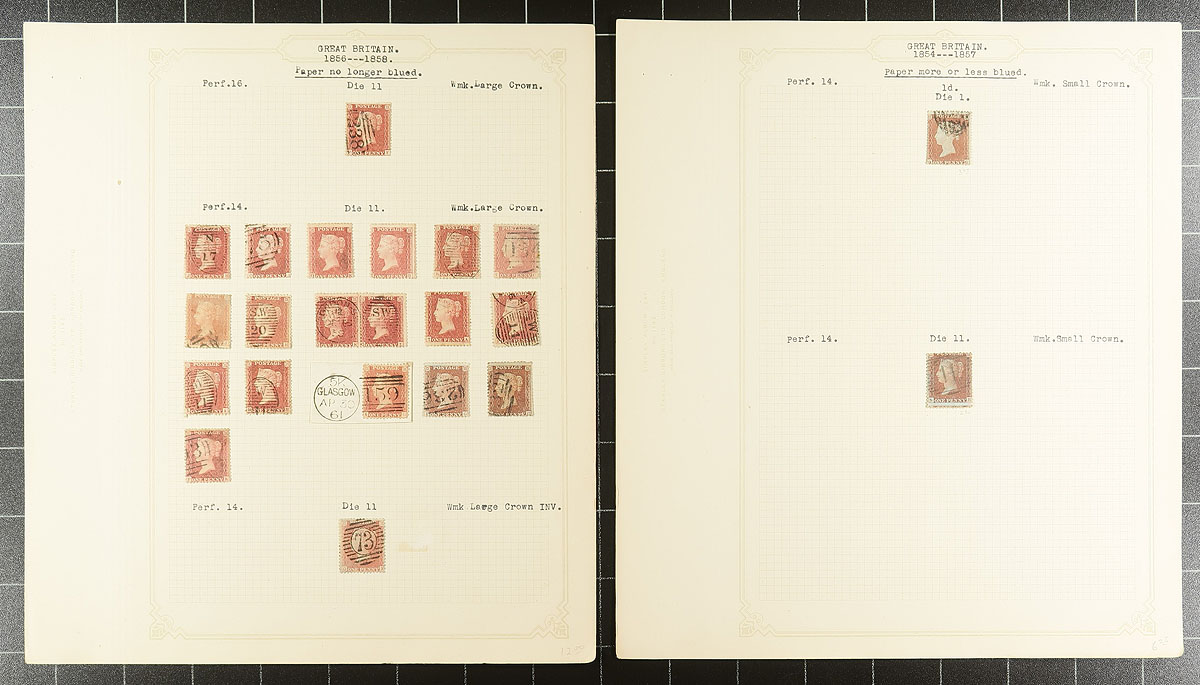 Scraps of collections (Part 1). We see a surprising number of British collection fragments: pages taken (and sometimes cut out) from a variety of sources, with different collecting styles and focuses. These pages often have some better singles, nice cancels and studies of plate numbers. For whatever reason, they have been left somewhat intact, awaiting the next collector to take a kick at improving their collection. This selection of pages, from at least four collectors, includes Queen Victoria with lots of “Penny Reds” and “Tuppence Blue”, and not much after 1860. We urge you to ignore the 1947 catalogue prices. Duplication and mixed condition is to be expected. Estimate =