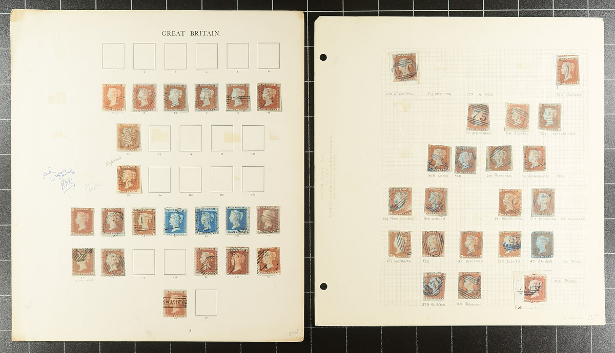 Scraps of collections (Part 1). We see a surprising number of British collection fragments: pages taken (and sometimes cut out) from a variety of sources, with different collecting styles and focuses. These pages often have some better singles, nice cancels and studies of plate numbers. For whatever reason, they have been left somewhat intact, awaiting the next collector to take a kick at improving their collection. This selection of pages, from at least four collectors, includes Queen Victoria with lots of “Penny Reds” and “Tuppence Blue”, and not much after 1860. We urge you to ignore the 1947 catalogue prices. Duplication and mixed condition is to be expected. Estimate =