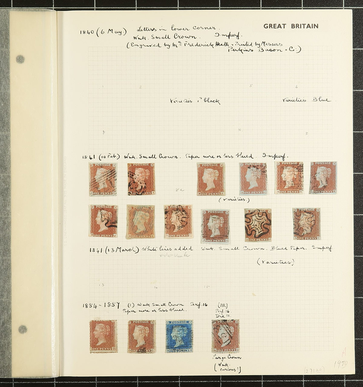 Scraps of collections (Part 1). We see a surprising number of British collection fragments: pages taken (and sometimes cut out) from a variety of sources, with different collecting styles and focuses. These pages often have some better singles, nice cancels and studies of plate numbers. For whatever reason, they have been left somewhat intact, awaiting the next collector to take a kick at improving their collection. This selection of pages, from at least four collectors, includes Queen Victoria with lots of “Penny Reds” and “Tuppence Blue”, and not much after 1860. We urge you to ignore the 1947 catalogue prices. Duplication and mixed condition is to be expected. Estimate =