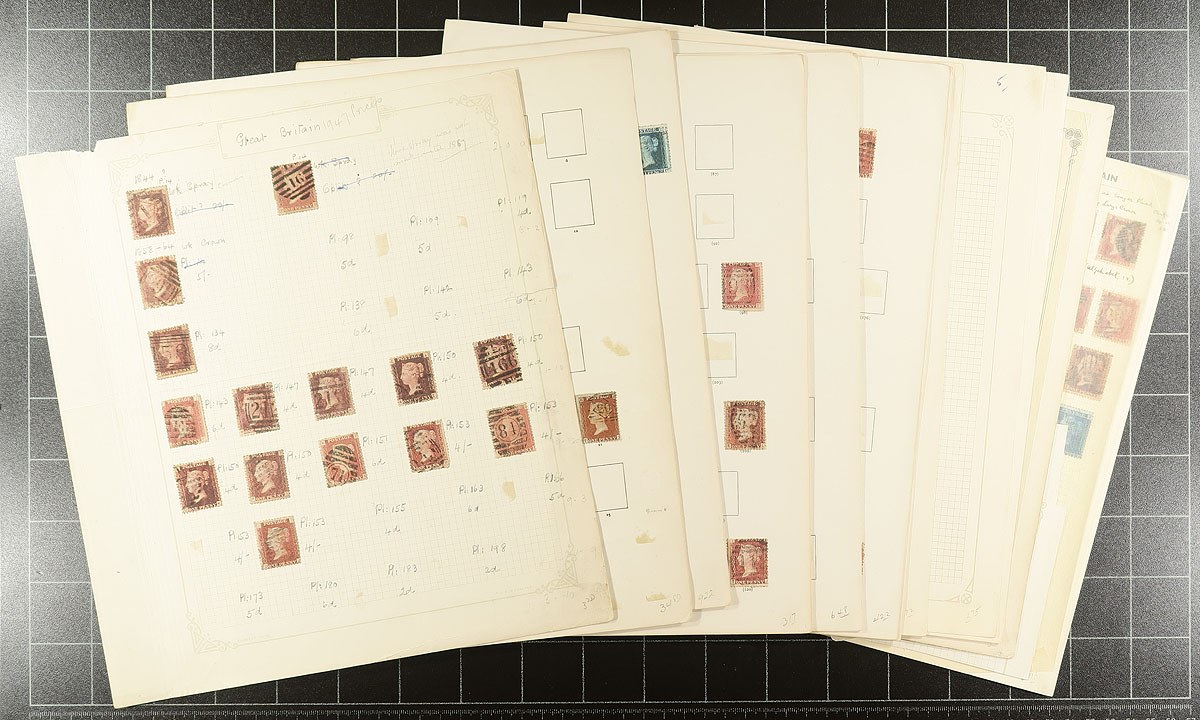 Scraps of collections (Part 2). We see a surprising number of British collection fragments: pages taken (and sometimes cut out) from a variety of sources, with different collecting styles and focuses. These pages often have some better singles, nice cancels and studies of plate numbers. For whatever reason, they have been left somewhat intact, awaiting the next collector to take a kick at improving their collection. This selection of pages, from at least four collectors, includes Queen Victoria with lots of “Penny Reds” (including some attempted plating of #33) and a smattering of “Tuppence Blue”, with not much after 1860. We urge you to ignore the 1947 catalogue prices. Duplication and mixed condition is to be expected. Estimate =