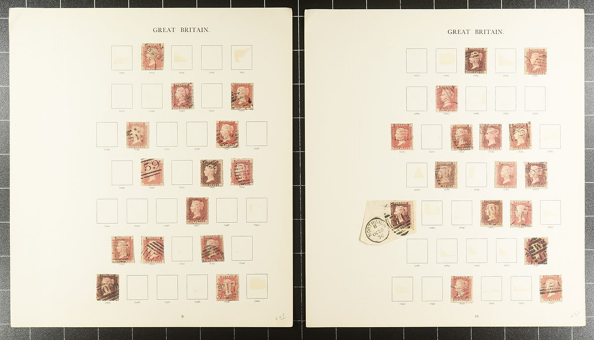 Scraps of collections (Part 2). We see a surprising number of British collection fragments: pages taken (and sometimes cut out) from a variety of sources, with different collecting styles and focuses. These pages often have some better singles, nice cancels and studies of plate numbers. For whatever reason, they have been left somewhat intact, awaiting the next collector to take a kick at improving their collection. This selection of pages, from at least four collectors, includes Queen Victoria with lots of “Penny Reds” (including some attempted plating of #33) and a smattering of “Tuppence Blue”, with not much after 1860. We urge you to ignore the 1947 catalogue prices. Duplication and mixed condition is to be expected. Estimate =