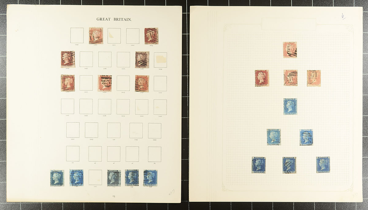 Scraps of collections (Part 2). We see a surprising number of British collection fragments: pages taken (and sometimes cut out) from a variety of sources, with different collecting styles and focuses. These pages often have some better singles, nice cancels and studies of plate numbers. For whatever reason, they have been left somewhat intact, awaiting the next collector to take a kick at improving their collection. This selection of pages, from at least four collectors, includes Queen Victoria with lots of “Penny Reds” (including some attempted plating of #33) and a smattering of “Tuppence Blue”, with not much after 1860. We urge you to ignore the 1947 catalogue prices. Duplication and mixed condition is to be expected. Estimate =