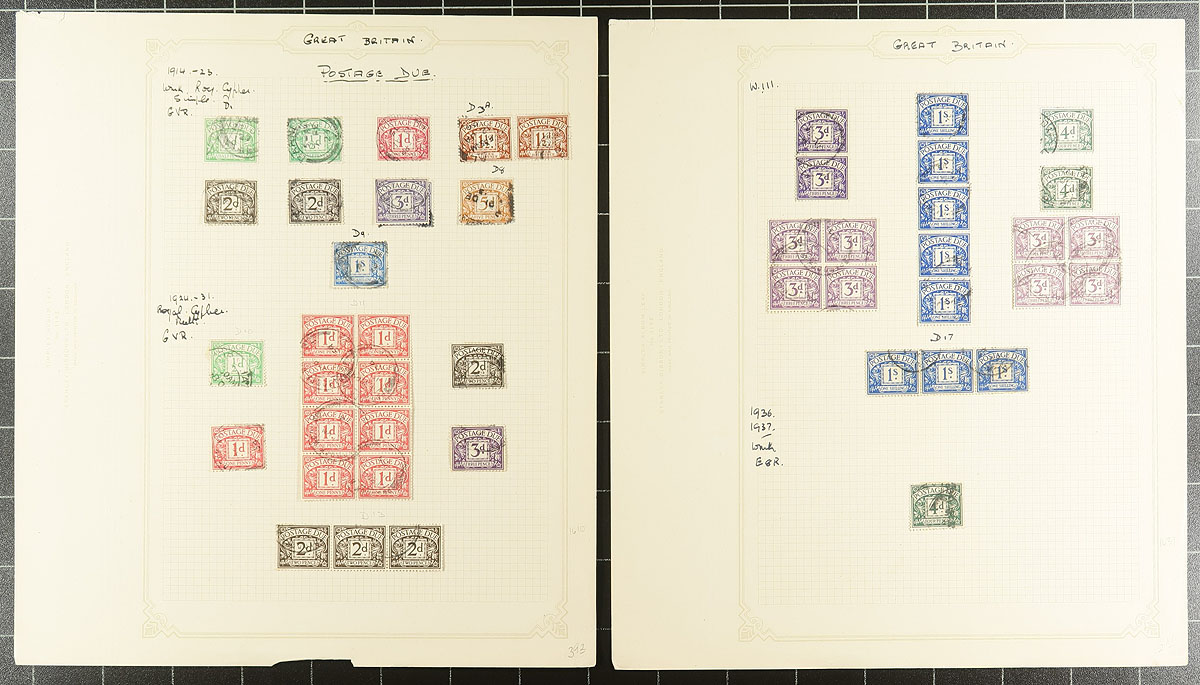 Scraps of collections (Part 3). We see a surprising number of British collection fragments: pages taken (and sometimes cut out) from a variety of sources, with different collecting styles and focuses. These pages often have some better singles, nice cancels and studies of plate numbers. For whatever reason, they have been left somewhat intact, awaiting the next collector to take a kick at improving their collection. This selection of pages, from at least four collectors, includes Queen Victoria starting with some “Penny Reds” , progressing through the “Jubilee” issue, a smattering of KEVII and a couple of pages of KGV plate number singles. The twist to this lot is a mix of used and mint postage dues. We urge you to ignore the 1947 catalogue prices. Duplication and mixed condition is to be expected. Estimate =