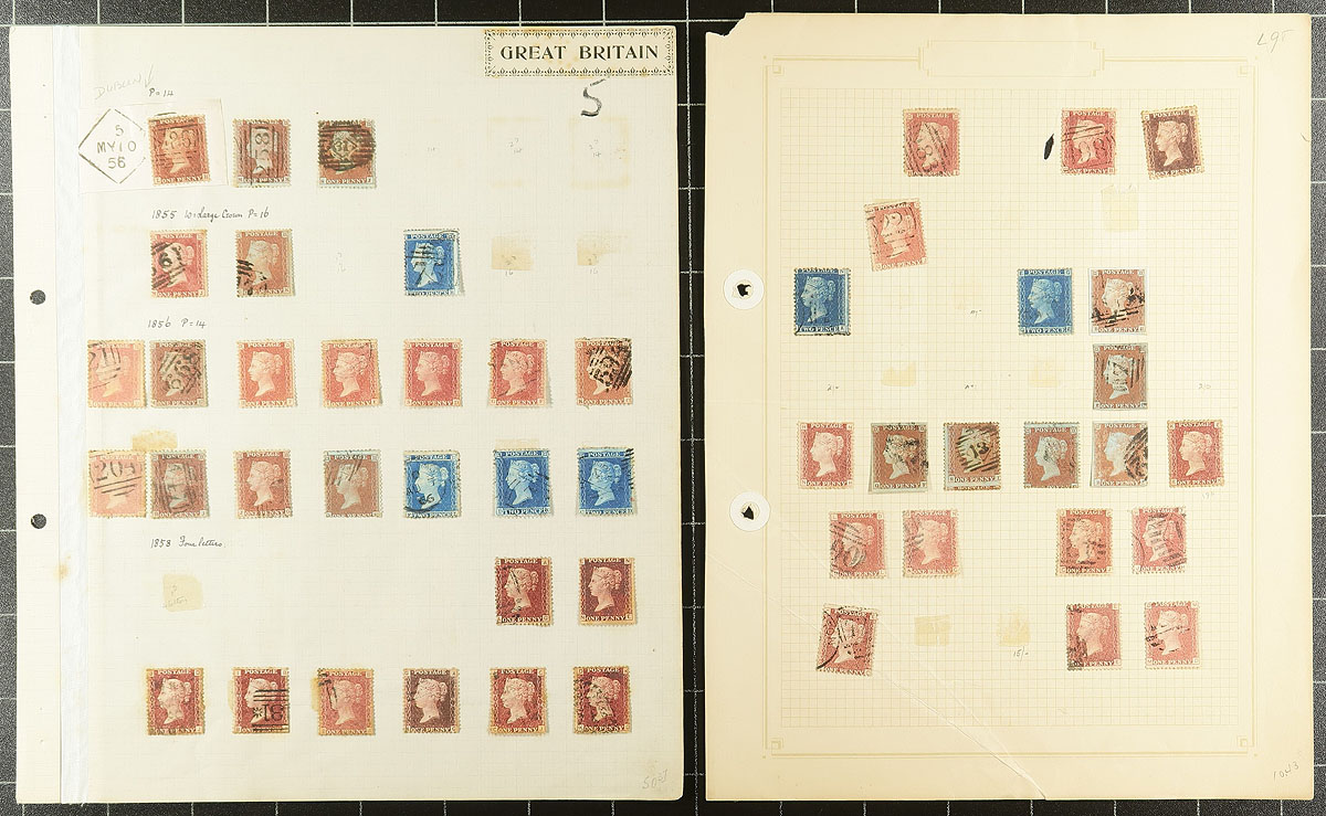 Scraps of collections (Part 3). We see a surprising number of British collection fragments: pages taken (and sometimes cut out) from a variety of sources, with different collecting styles and focuses. These pages often have some better singles, nice cancels and studies of plate numbers. For whatever reason, they have been left somewhat intact, awaiting the next collector to take a kick at improving their collection. This selection of pages, from at least four collectors, includes Queen Victoria starting with some “Penny Reds” , progressing through the “Jubilee” issue, a smattering of KEVII and a couple of pages of KGV plate number singles. The twist to this lot is a mix of used and mint postage dues. We urge you to ignore the 1947 catalogue prices. Duplication and mixed condition is to be expected. Estimate =