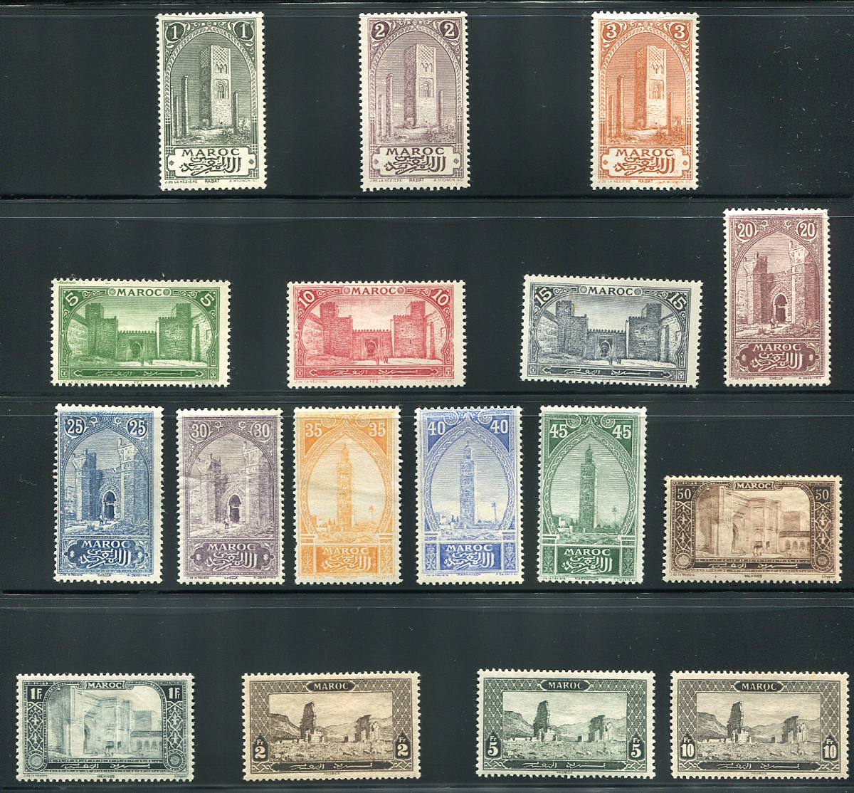 The complete WWI-era issue, the first produced specifically for and depicting Morocco. A tough set of 17 to find complete, mint, and this is a beauty, with the high values being fresh and well centered. All are hinged, with the occasional natural gum bend here or there. 2024 Scott US$331.60 =