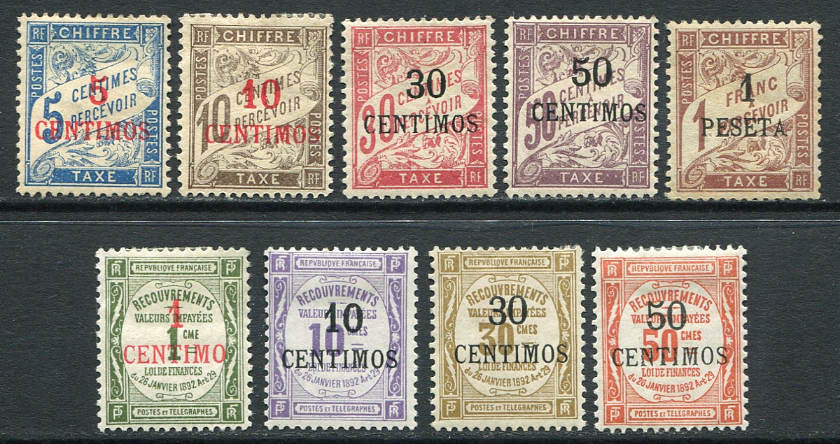 The complete first two postage due issues of 1895 and 1909, with overprints on French dues. An attractive mint, hinged, group of nine stamps. All hinged, a couple with hinge remnants. The good #J5 has possibly been regummed although it catalogues the same mint and used. We rarely see this "back of the book" material. 2024 Scott US$622.00 =