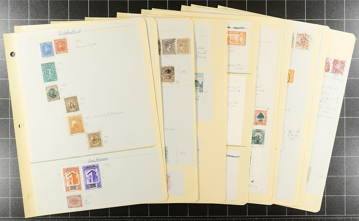 Seventy-five year young "sampler" collection, with representation from over 100 different countries and colonies. A mix of mint and used stamps, including some "back of the book" and some nice cancels amongst the used. The grandson of the original collector cut the original pages from their album and remounted them on 3-ring pages. While there are bits and pieces from all over, we noted strength in Europe (e.g. Belgium, Great Britain and colonies, Hungary, Netherlands, Portugal and colonies, Romania, Russia, Switzerland), Asia (China, Japan), South America (Argentina, Brazil). Most appear to be more common but better may be lurking amongst the 2000 stamps. Estimate =