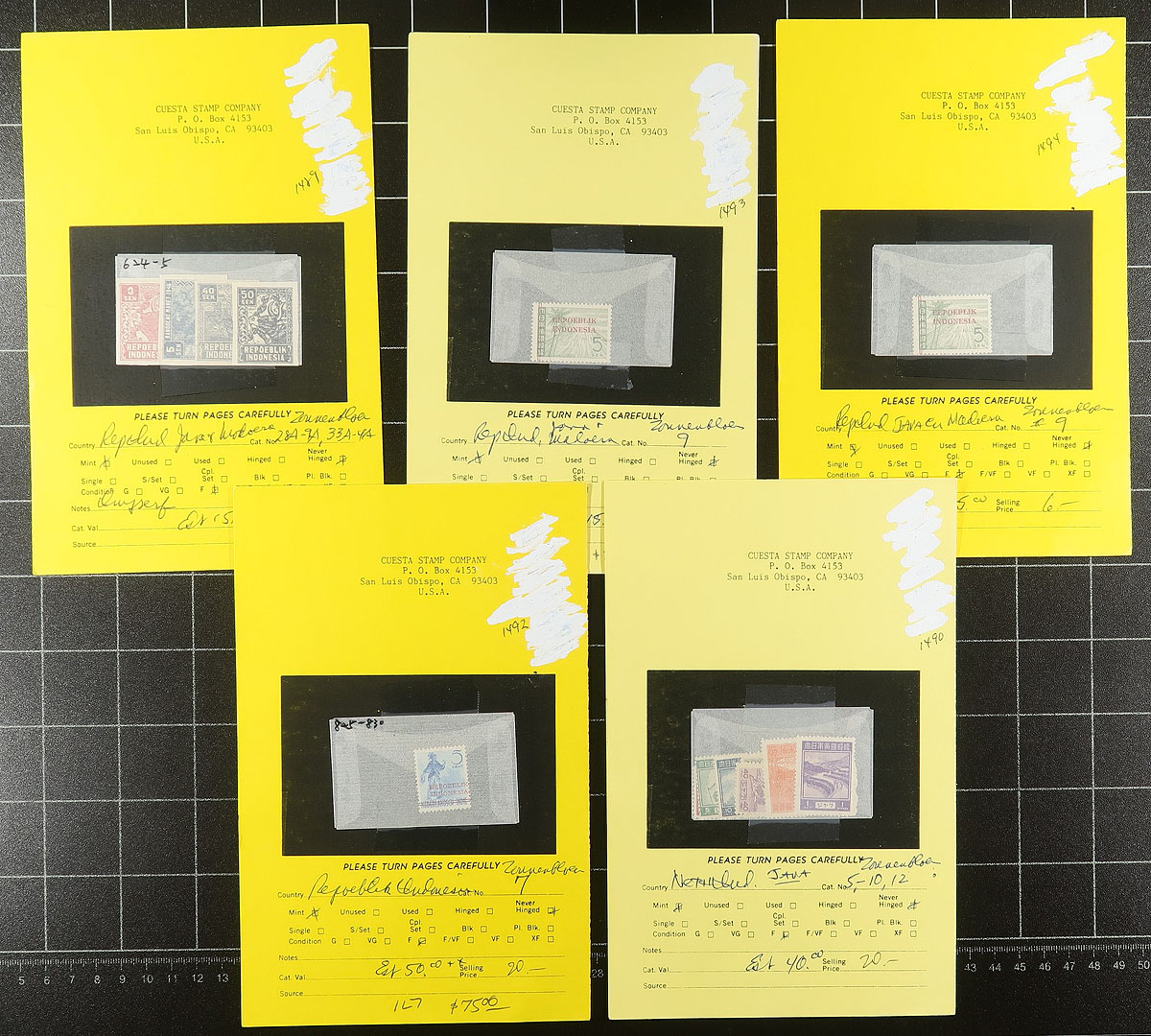 An untamed accumulation in three stanzas. There is some Japanese occupation material in a stockbook (untouched since being purchased at auction). The early Republic issues are well represented, including overprints, with a few sets and souvenir sheets of the 1949 UPU issue. The last piece is more recent partial sheets and souvenir sheets (1980's up to about 1997). Plus, there is other material on "102" cards to help round out this offering. Most are auction purchases that were set aside without processing. Estimate =