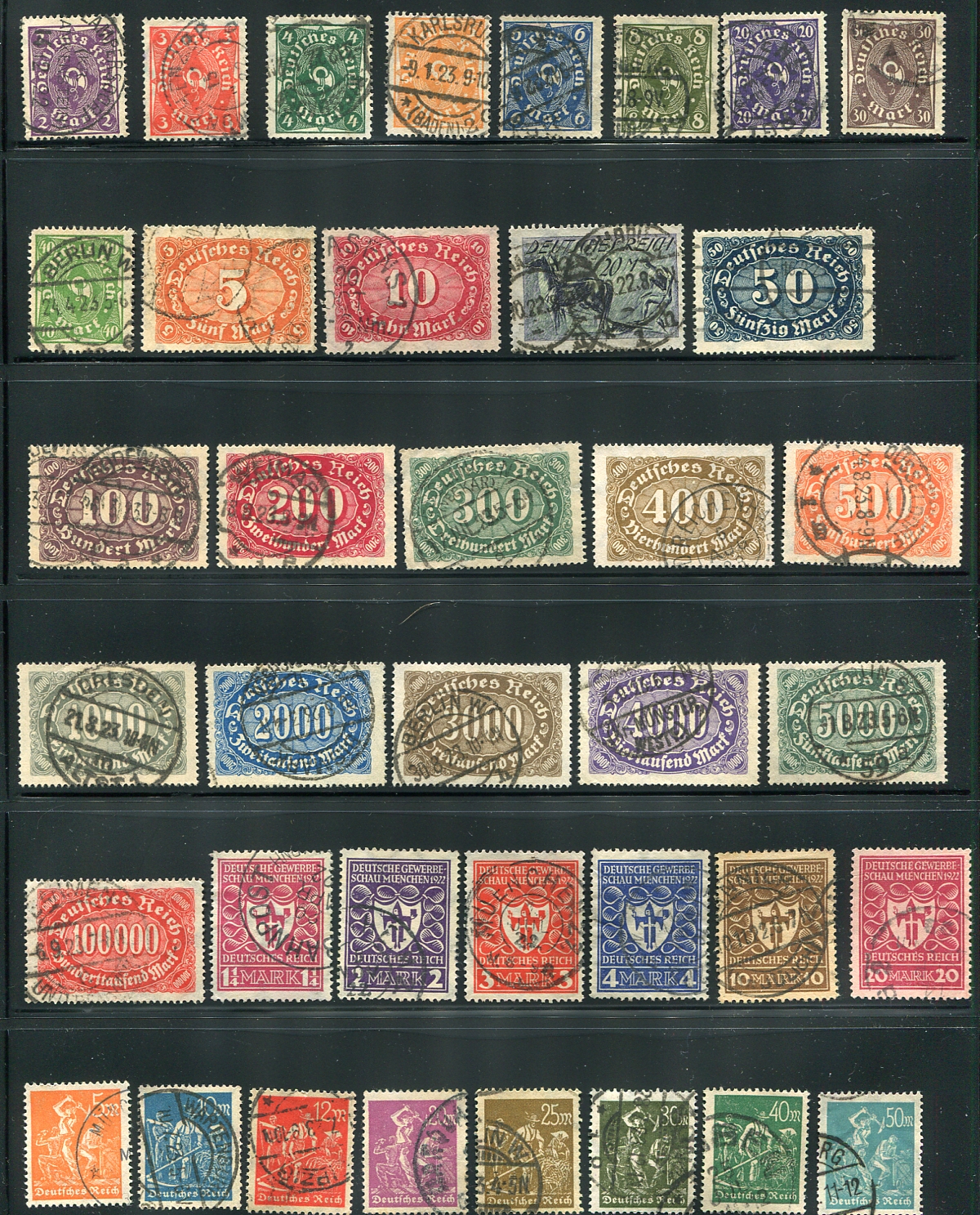 Two-page selection of all-different used "Hyper-Inflation" issues from 1922-1923, when post-war reparations wrecked the German economy. The rapid devaluation of currency meant that stamps were near-worthless upon issuance, resulting in most mint issues still having little value after 100 years. However, used examples are much harder to find. This lot includes individual items with catalogue values to $110.00 and a number have been selected for their clear, readable cancels. 2024 Scott US$517.70 =