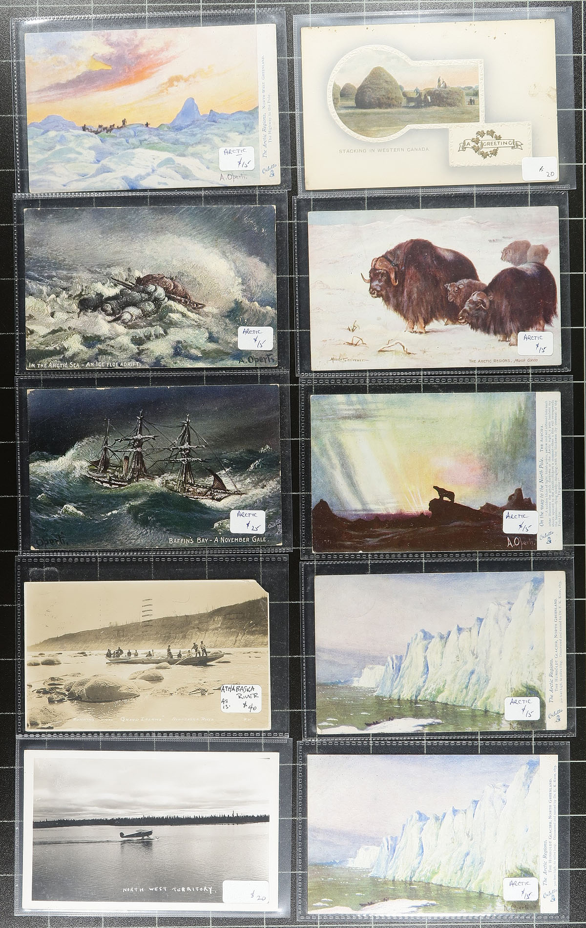 Northern picture postcards, most 1910-1960 from Yukon, Northwest Territories, even a bit of Labrador and a couple from Alaska. Shows scenery, local people, transportation. Includes real photo, printed cards and some "Tucks" oilettes. 65 different, a mix of mint and used. Not often seen. Many are individually sleeved and dealer priced. Estimated value =