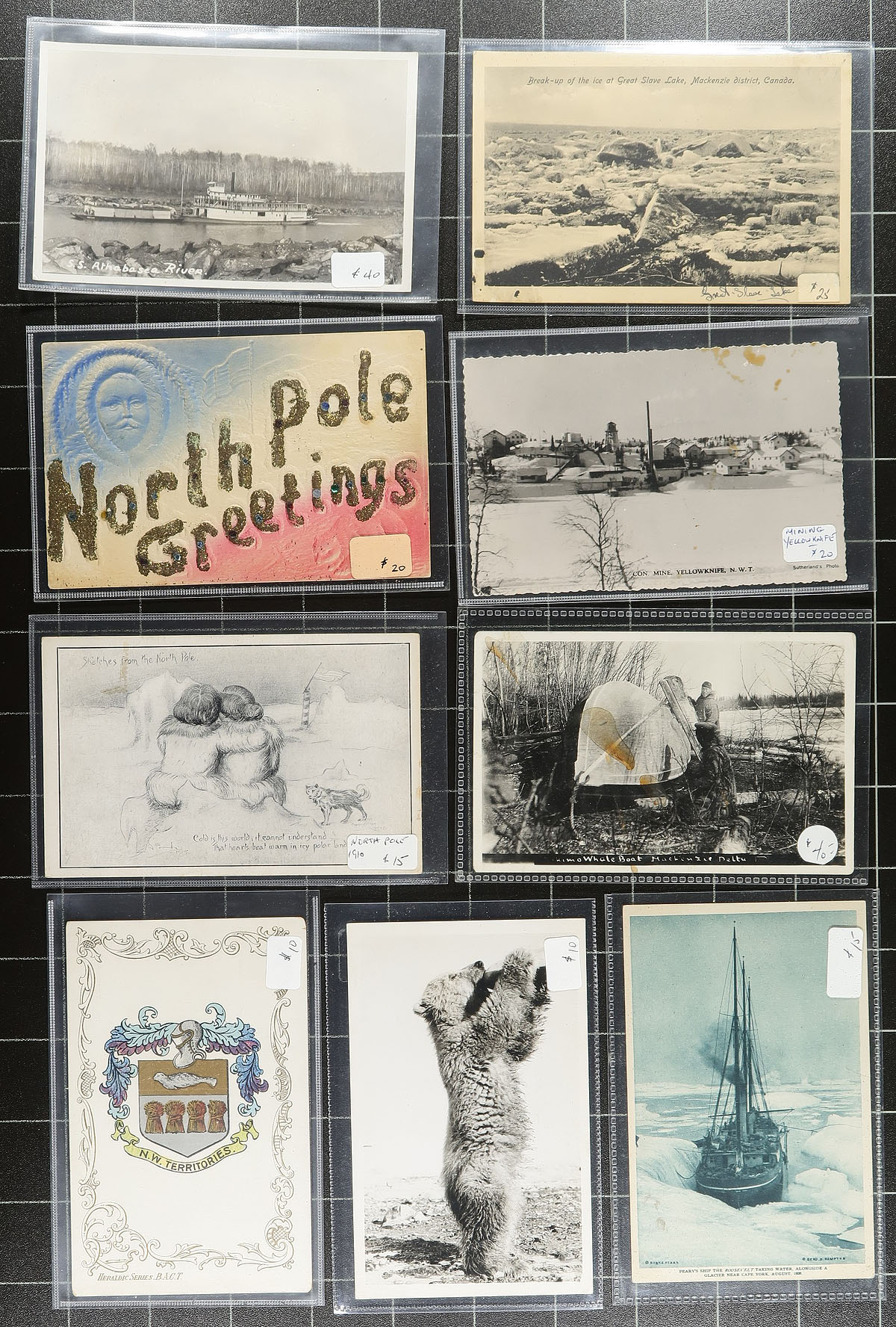 Northern picture postcards, most 1910-1960 from Yukon, Northwest Territories, even a bit of Labrador and a couple from Alaska. Shows scenery, local people, transportation. Includes real photo, printed cards and some "Tucks" oilettes. 65 different, a mix of mint and used. Not often seen. Many are individually sleeved and dealer priced. Estimated value =