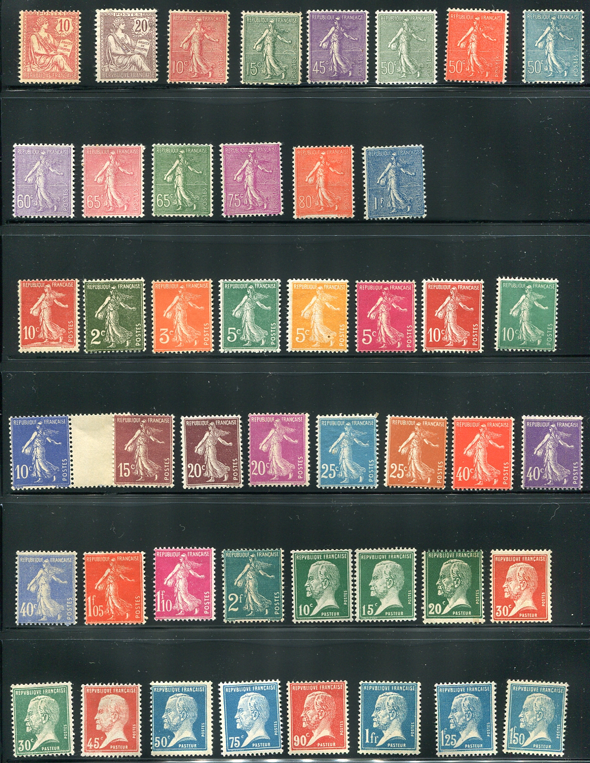 Thirty years’ worth of early 20th century mint French definitives and commemoratives. Starts with a duo from the "Rights of Man" set (#135), with a good range of "Sowers", the complete "Pasteur" issue, plus the Paris Olympics and Exhibitions sets with "Mont St. Michel" and "Arch de Triumph", plus a single 5 franc from the souvenir sheet (#226b). All are hinged, a few with minor hinge remnants. 2024 Scott US$660.75 =