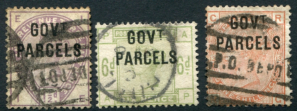 Trio of used Queen Victoria 1883-1886 issues overprinted "Govt Parcels", with usual parcel cancels. The overprints look good. Usual minor faults that come from being on parcels. 2024 Scott US$2065.00 =