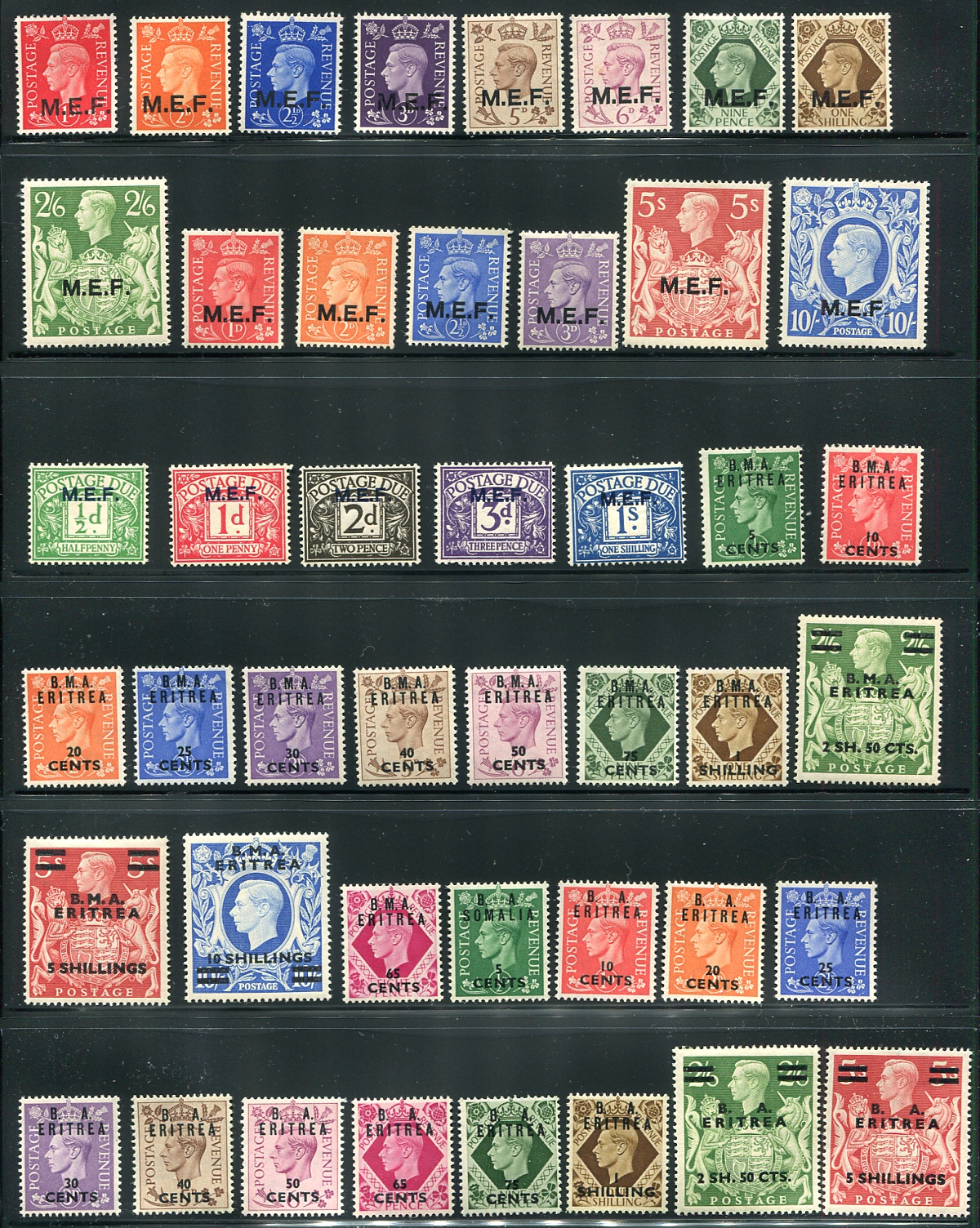 Complete mint "MEF" (Middle East Forces which were actually former Italian colonies in Africa) and "Eritrea" King George VI overprinted stamps of Great Britain, including postage dues. Fresh appearance. All are hinged, many lightly. A very popular sideline for British, Commonwealth and Africa collectors. 2024 Scott US$518.30 =