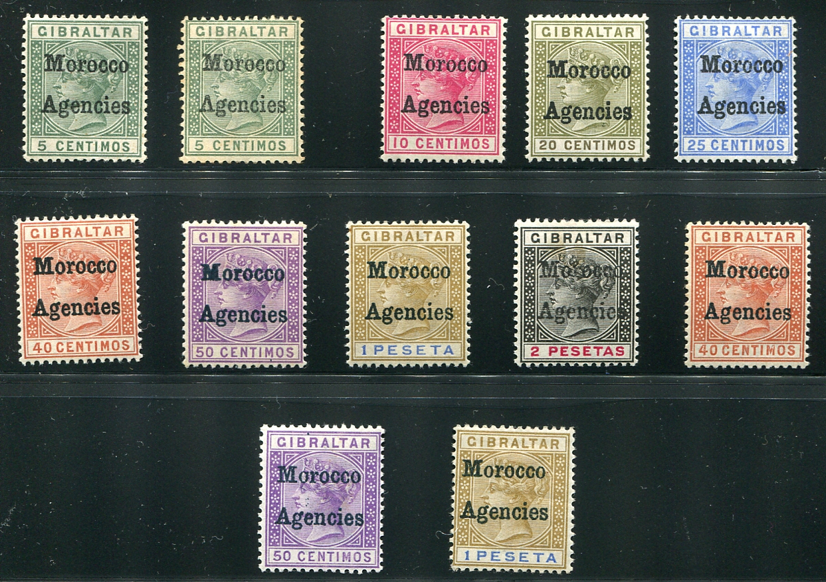 Mint Gibraltar, Queen Victoria definitives in Spanish currency overprinted "Morocco Agencies", a complete first set. Comes with the 5c having an inverted "V" instead of an "A" (looks like an "A" with no cross piece). Attractive mint, with usual mix of hinging. 2024 Scott US$483.50 =