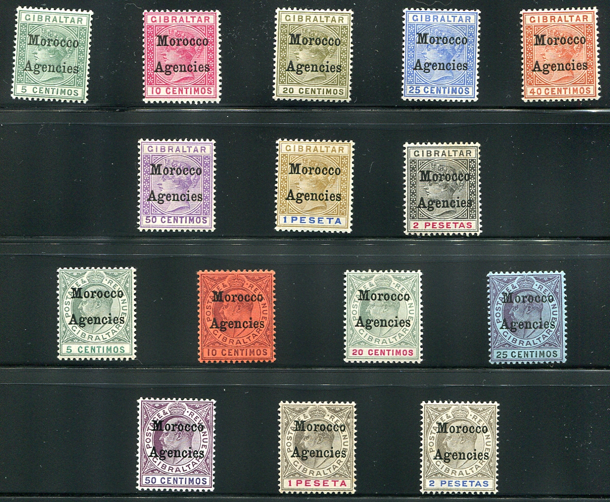 Two complete sets of mint Gibraltar issues in Spanish currency overprinted "Morocco Agencies". The first is the Queen Victoria with the second overprint with the narrower "M" and the first King Edward VII set. A strikingly fresh group of stamps, with mixed hinging (from very light to minor hinge remnants). 2024 Scott US$390.25 =