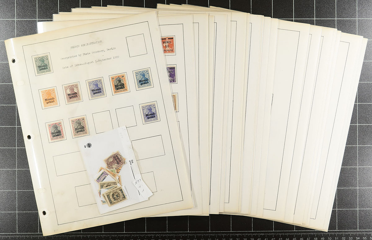 Tidy collection of mint and used Memel, 1920-1923, containing roughly 200 stamps in nicely organized homemade pages. The collection generally ranges from Scott #1/99, along with a few airmails, and several occupation stamps ranging from N1/N82. The collection contains primarily sets and partial sets, with some issues having a mint and or a used example. We noted some stamps and sets cataloguing $20 to $35 and up each. A lovely collection from an intriguing time period and should be continued until completion. Overall fine to very fine. 2026 Scott US$702.30 =